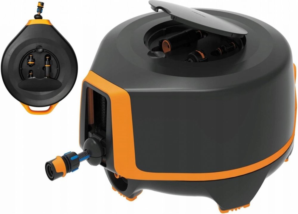 - Integrovaná skrínka na príslušenství obsahuje nastavitelnou zavlažovací koncovku, univerzální spojku na vodovodní kohoutek a prodlužovací spojku na hadice.