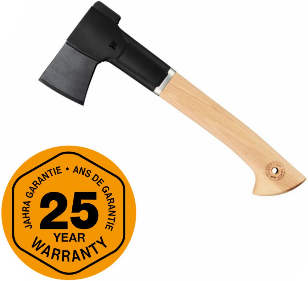 Dřevěné topůrko je vsazeno hluboko do plastové části, která tvoří nejodolnější ochranu proti jeho zlomení při nárazu na poleno, když ho při štípání mineme čepelí.