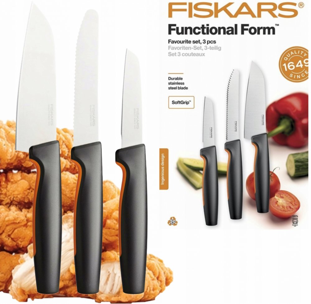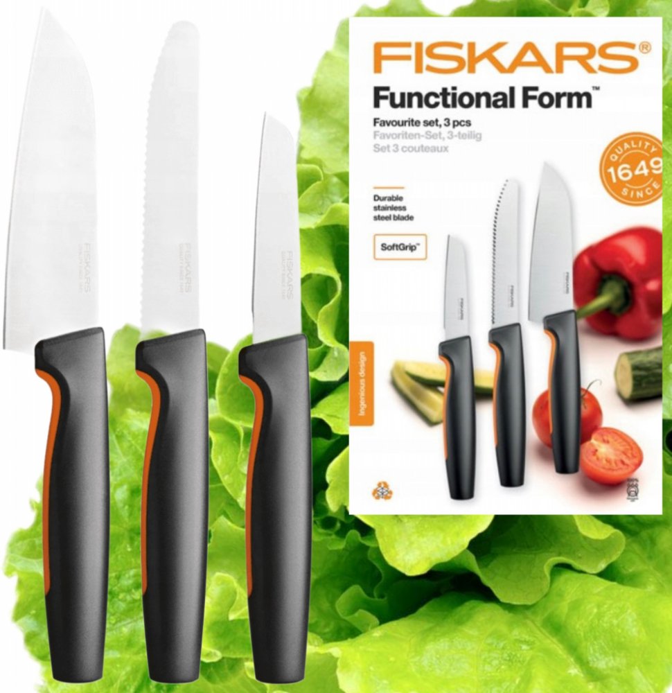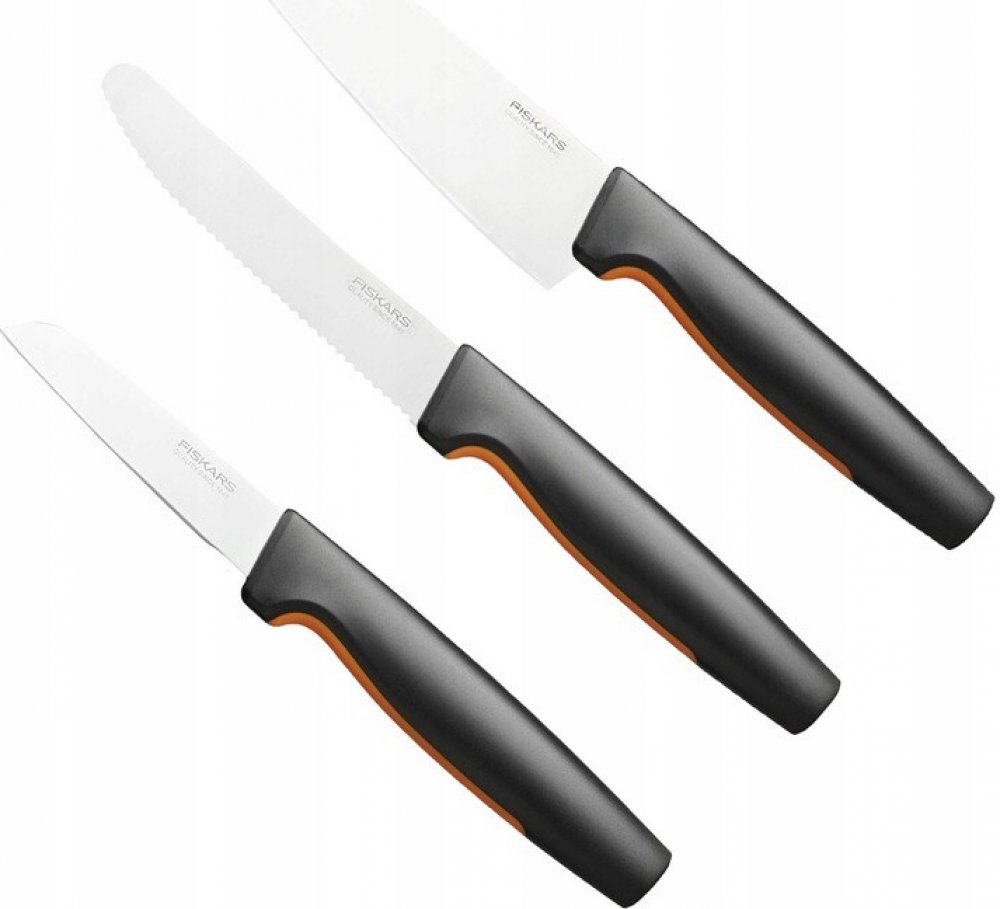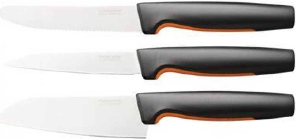 Praktická sada Fiskars kuchyňských nožů pro každodenní použití. Kompaktní a lehký loupací nůž 1057544 s 8 cm čepelí je ideální pro loupání a krájení malého ovoce a zeleniny. Snadno s ním oškrábete nové brambory či mrkev, zrovna tak i rozkrájíte švestky nebo nakrájíte malou cibuli. Loupací nůž s rovnou čepelí Fiskars Functional Form ™ je navržený pro pohodlné používání a snadnou údržbu Ideální pro oloupávání ovoce a zeleniny Odolná rovná čepel z japonské nerezové oceli Ergonomická rukojeť s povrchem SoftGrip ™ v místě uchopení Hluboký chránič prstů poskytuje pohodlné a bezpečné držení Lze mýt v myčce na nádobí Délka čepele 80 mm Tvrdost čepele HRC 52 Snídaňový nůž 1057543 má vroubkované 12 cm dlouhé ostří a je ideální pro krájení potravin s kůrkou, jako například čerstvého pečiva nebo menšího chlebíku. Setkat se můžete též s názvem nůž na rajčata, neboť se s ním výborně krájí i potraviny s tenkou slupkou, obzvláště rajčata či broskve. Vhodný je také jako jídelní nuž na steaky. Snídaňový nůž Fiskars Functional Form ™ je navržený pro pohodlné používání a snadnou údržbu Ideální pro krájení potravin s tvrdou kůrkou nebo slupkou, jako je pečivo nebo rajčata Odolná čepel se zoubky vyrobená z japonské nerezové oceli Ergonomická rukojeť s povrchem SoftGrip ™ v místě uchopení Hluboký chránič prstů poskytuje pohodlné a bezpečné držení Lze mýt v myčce na nádobí Délka čepele 113 mm Tvrdost čepele HRC 52 Vysoký řezací výkon (testováno podle metodiky CATRA) Navrženo ve Finsku Malý univerzální kuchařský nuž 1057541 se silnou 13 cm čepelí je ideální pro krájení masa, uzenin či zeleniny. Malý kuchařský nůž Fiskars Functional Form ™ je navržený pro pohodlné používání a snadnou údržbu Ideální pro většinu druhů krájení v kuchyni Odolná čepel z japonské nerezové oceli Ergonomická rukojeť s povrchem SoftGrip ™ v místě uchopení Hluboký chránič prstů poskytuje pohodlné a bezpečné držení Lze mýt v myčce na nádobí Délka čepele 120 mm Tvrdost čepele HRC 52