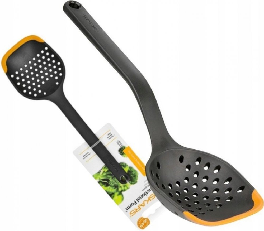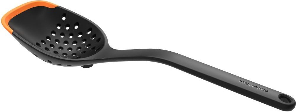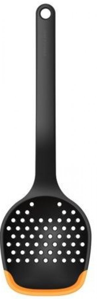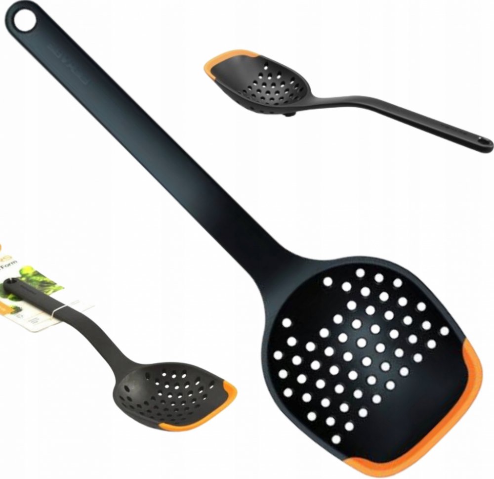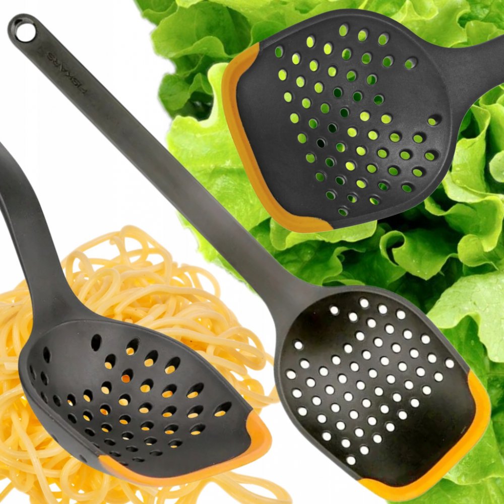 Kvalitní plastová děrovaná lžíce má pružné silikonové okraje, které snadno vytřou každé nádobí. Otvory jsou vhodné pro slévání a odkapání potravin. Na konci rukojeti je praktický otvor na zavěšení. Vhodná pro praváky i leváky.