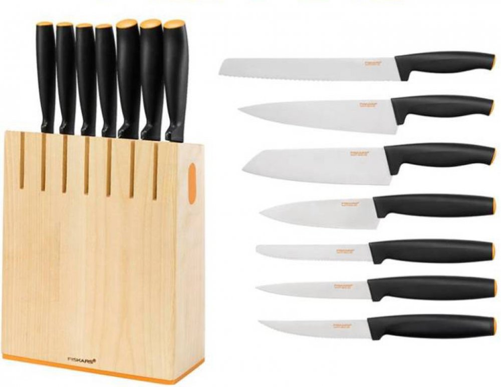 Elegantní praktická sada obsahující nejpoužívanější nože Fiskars. Sada je dodávána v dárkovém balení. Blok na nože má oranžovou silikonovou základnu, která zamezí poškrábání pracovní desky. Na boku dřevěného bloku na nože se nachází oranžový, velmi silný magnet k uchycení nože, nebo nůžek.