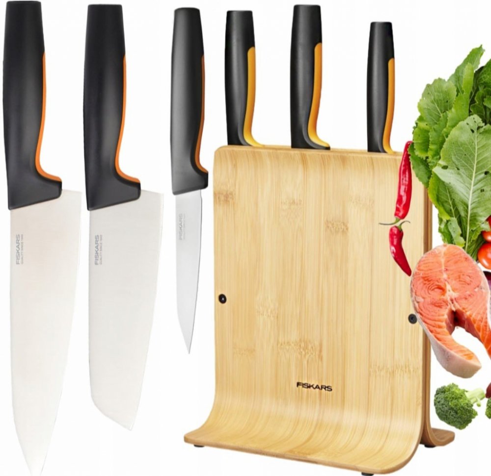 Elegantní bambusový stojan se třemi noži Fiskars Functional Form™ obsahuje tři základní nože: okrajovací nůž, nůž Santoku a velký kuchařský nůž. Sada je určena pro každodenní vaření. Tři nože pokryjí většinu kuchyňských potřeb – od jemné práce s ovocem přes asijskou kuchyni až po krájení velkých kusů masa.