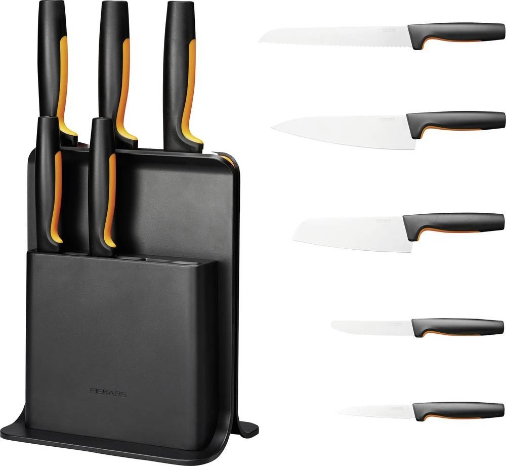 Plastový blok nožů Fiskars Functional Form ™ obsahuje 5 nožů: velký kuchařský nůž, nůž na chléb a pečivo, nůž Santoku, nůž snídaňový a okrajovací nůž. Blok na nože je vyroben z plastu.