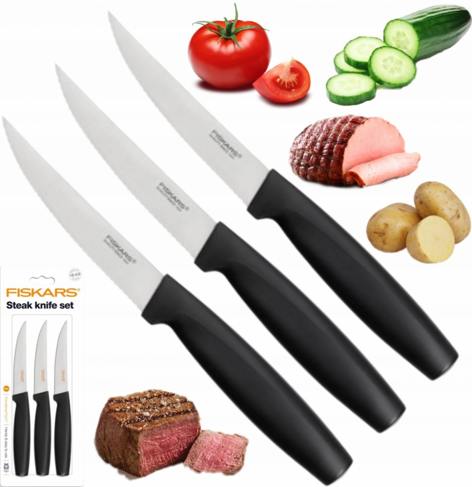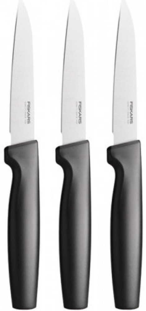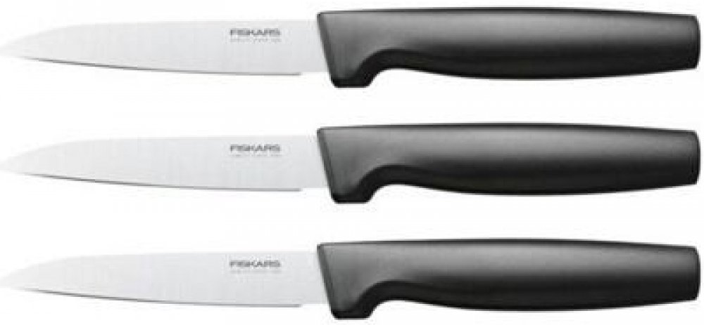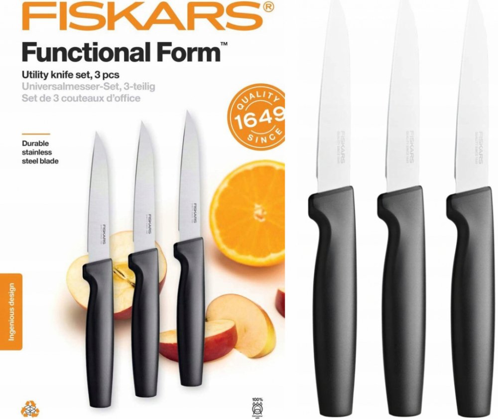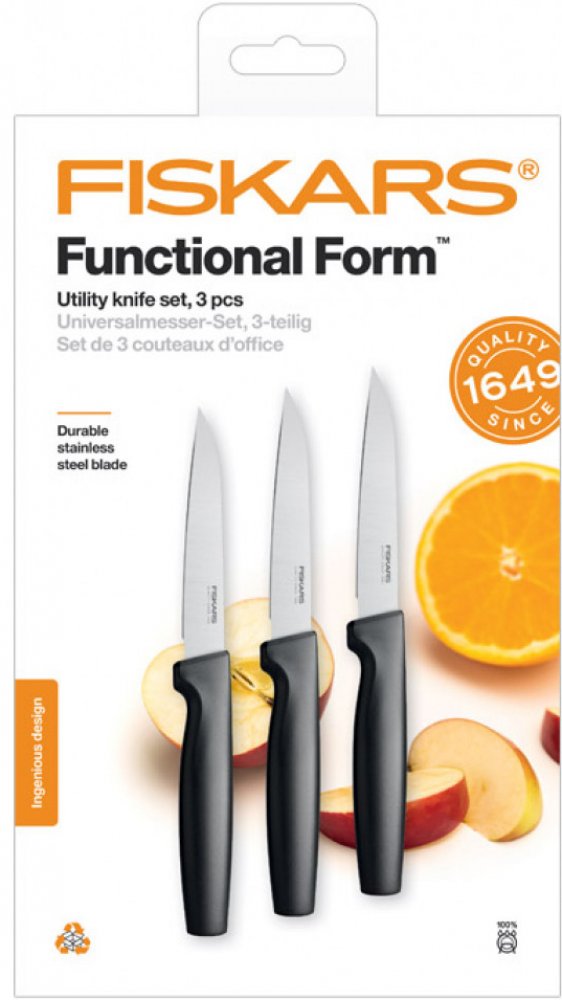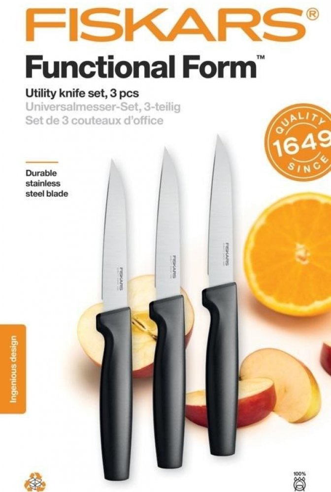 • Sada 3 univerzálních nožů Fiskars Functional Form pro různé použití v kuchyni. br• Vysoce kvalitní japonská nerezová ocel zajištuje skvělou ostrost a korozivzdornost. br• Zesílená čepel pro dobré vyvážení nože a jeho pevnost. br• Nože mají leštěné ostří. br• Nože Fiskars Functional Form™ lze umývat v myčce na nádobí. br• Bezpečné a neklouzavé uchopení díky materiálu Softouch™ br• Hluboké zahloub...