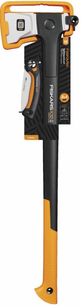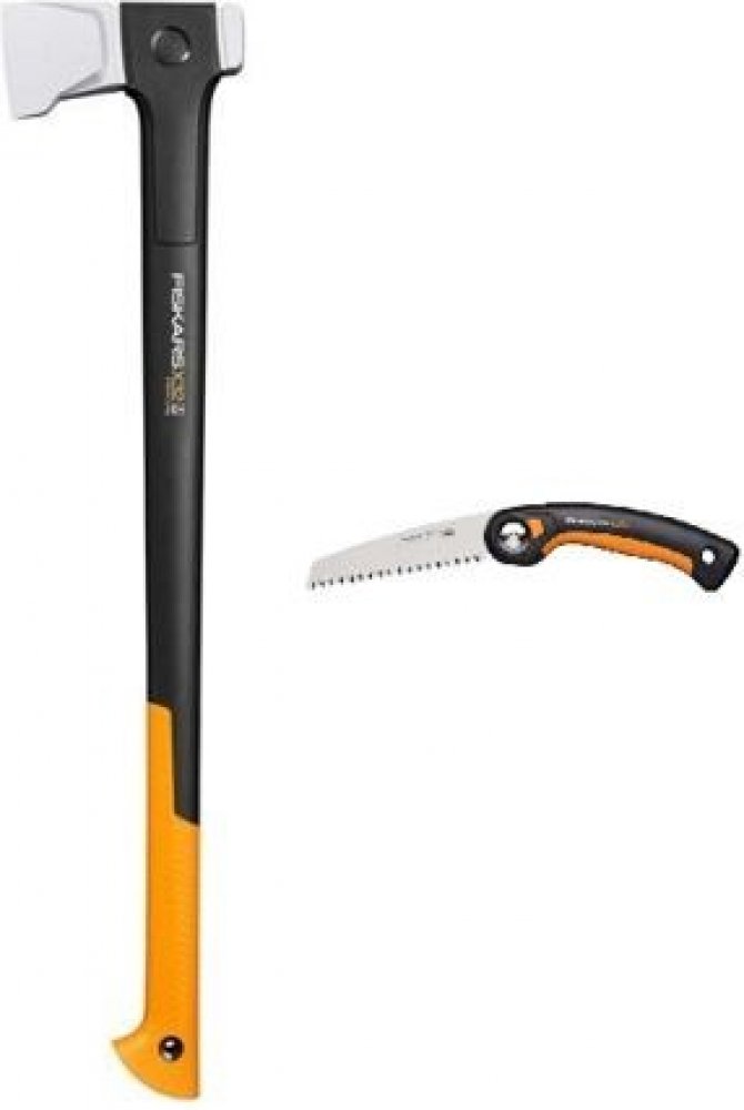Sada obsahuje štípací sekeru X32 a skládací pilu SW68 Fiskars.