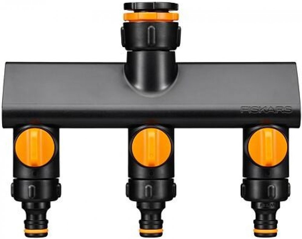 Fiskars Trojcestný kohoutkový ventilRozděluje jeden zdroj vody na dvě přípojky s nezávislými regulačními ventily. Koncové rychlospojky lze odšroubovat pro připojení dalšího příslušenství se závitem G 3/4" (např. zavlažovací počítač). Vhodný pro připojení na vodovodní kohoutek s velikostí závitu: Ø 21mm (G 1/2"), Ø 26,5mm (G 3/4"), Ø 33,3mm (G 1"). Universální připojení je kompaktibilní s ostatními...
