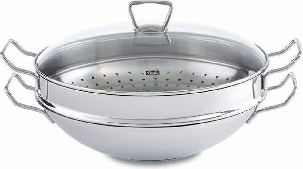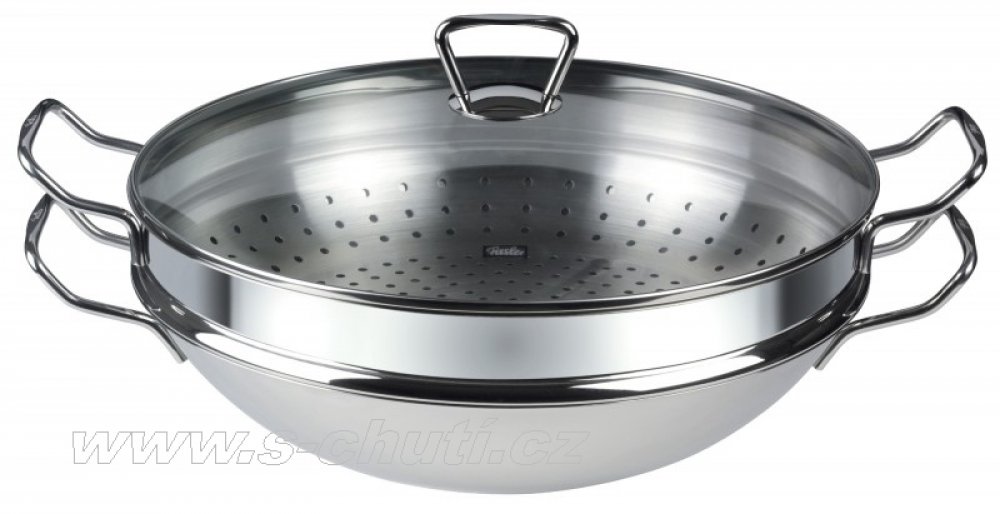 Nerezová pánev Wok Nanjing 36 cm se skleněnou poklicí a napařovací vložkou, vhodná pro všechny druhy ohřevu včetně indukčního (uvedený rozměr vyjadřuje průměr pánve) Ať už zbožňujete exotickou kuchyni, nebo jen chcete vařit šetrněji a zdravěji, pánve wok značky Fissler vám přinesou nevšední kulinářské zážitky. Vynikající kvalita materiálu a špičkové zpracování jsou skvělým předpokladem pro přípravu orientálních pochoutek. Wok z ušlechtilé oceli se skleněnou poklicí a napařovací vložkou Pohodlná kovová držadla z ušlechtilé oceli a praktická fritovací mřížka Vhodná pro všechny druhy sporáků včetně indukčních