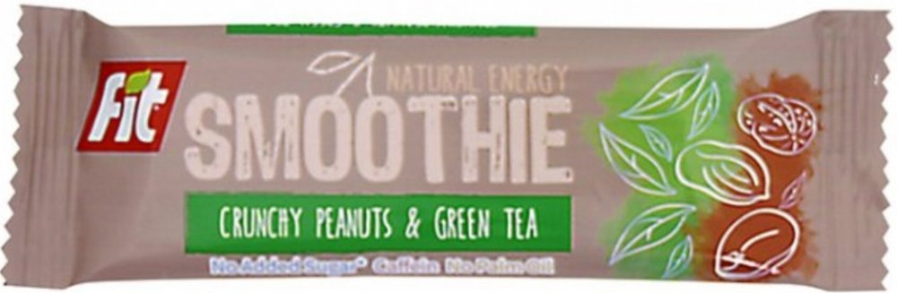 Fit Smoothie Tyčinka arašídy + zelený čaj 32 g. Tyčinka do školy, na výlet. Složení: datlová pasta, pražené arašídy 14 %, rozinky 14 % (rozinky, slunečnicový olej), pražená arašídová pasta 6 %, slunečnicová semínka, sojový extrudát (isolovaný sojový protein, tapiokový škrob), oplatka (bramborový škrob, voda, olivový olej), kofein 0,2 %; přírodní aroma, mořská sůl, extrakt ze zeleného čaje 0,05 %. Vyrobena pouze z přírodních surovin (sušené ovoce, zelenina, slunečnicové semínko), obsahuje více než 80 % ovoce a zeleniny