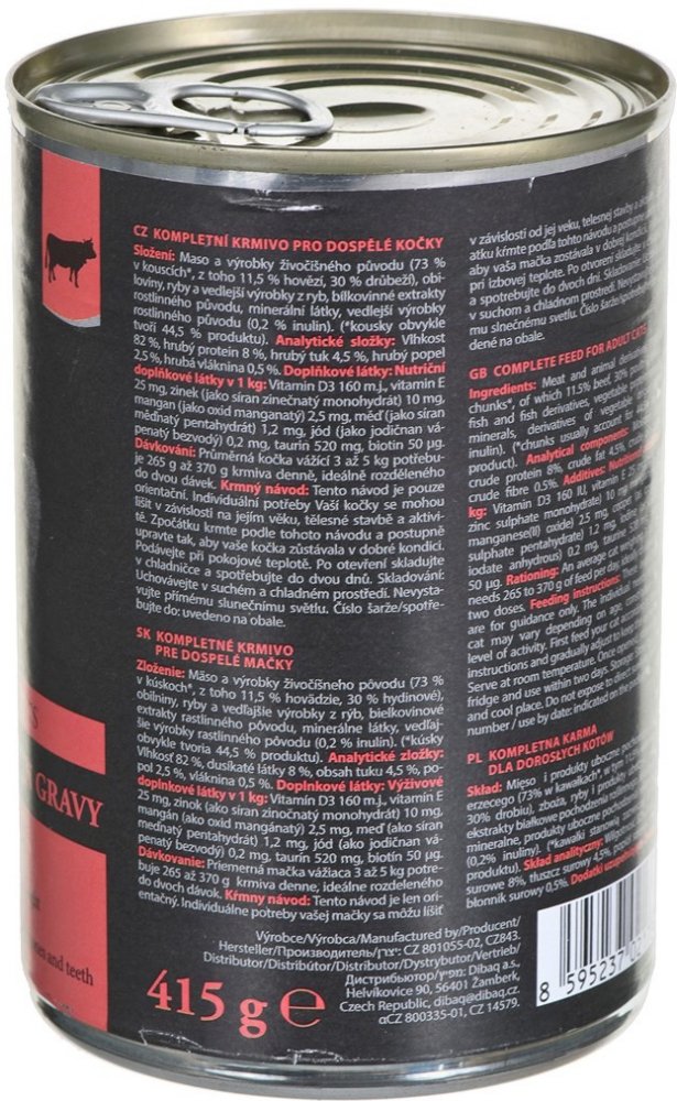 Maso: 60 % hovězí, 40 % kuřecí, ve vlastní šťávě.