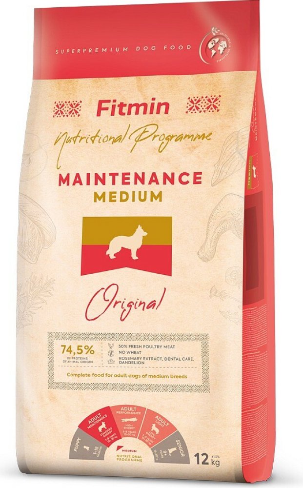 Fitmin Dog Medium Senior Original je superprémiové krmivo vyvinuté speciálně pro potřeby starších psů středních plemen. Receptura postavená na čerstvém drůbežím a sušeném rybím mase s rýží a kukuřicí je snadno stravitelná a hypoalergenní – bez pšenice. Krmivo je bohaté na přírodní látky podporující celkové zdraví: šípek jako zdroj vitamínu C posiluje imunitu a působí pozitivně na močové cesty, čekanka přispívá k rovnováze střevní mikroflóry, a jablečné a řepné výlisky usnadňují trávení.