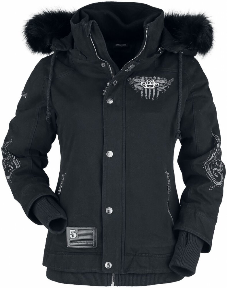 Doručení Zdarma | Od 1.500 Kč. Oficiální merchexkluzivně v EMP - Five Finger Death Punch EMP Signature Collection Zimní bunda pro Ženy k dispozici ve velikostech S. Informace: Barva: černá, Vzor: Čepel, Lebky, ozdoby, Hlavní materiál: 100% bavlna, Podšívka: 100% polyester, Délka rukávu: Dlouhá ruka,