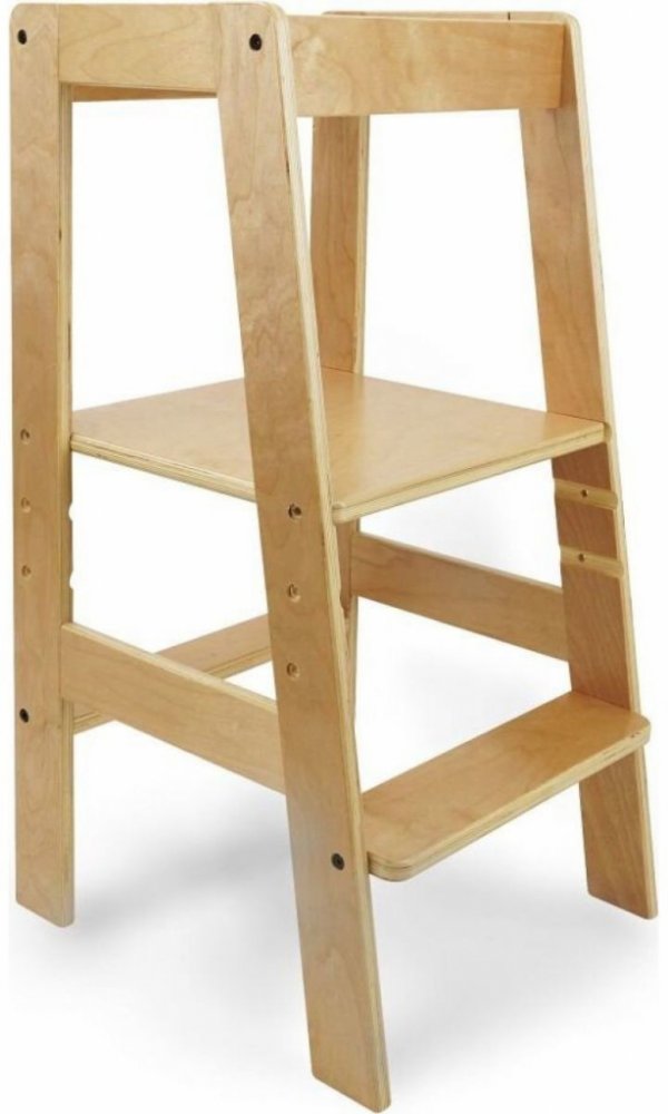 Učící věž. Věž je vyrobena z vysoce kvalitní překližky. Maximální nosnost do 50 kg. U plošiny jsou možné 3 výškové úpravy, aby vyhovovaly výšce dítěte: 34, 40,5 nebo 47 cm Dítě může vylézt na výukovou věž samostatně, schod od podlahy je ve výšce 20 cm, což pomáhá dítěti dostat se na věž/bezpečně. Navrženo pro většinu kuchyňských linek nebo koupelnových umyvadel. Dřevěný materiál byl testován a neo...