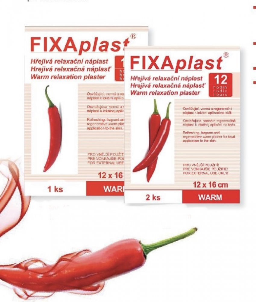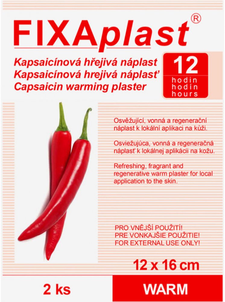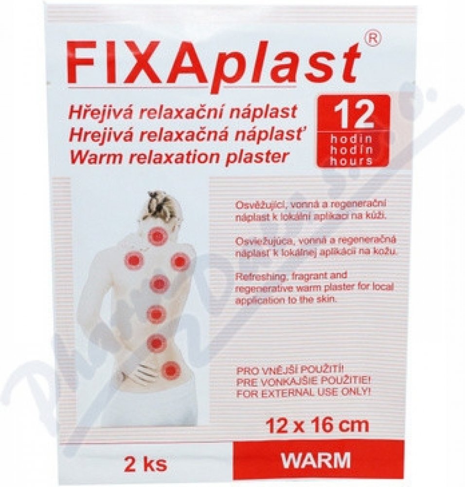 Rozměr: 12 cm x 16 cm Upozornění Pro vnější použití! Balení Hřejivá náplast Fixaplast WARM 2 ks.