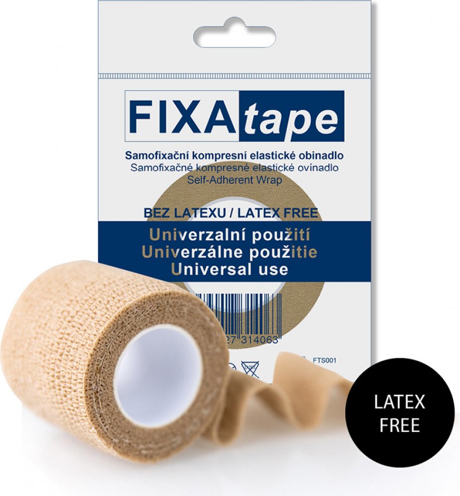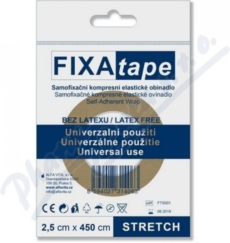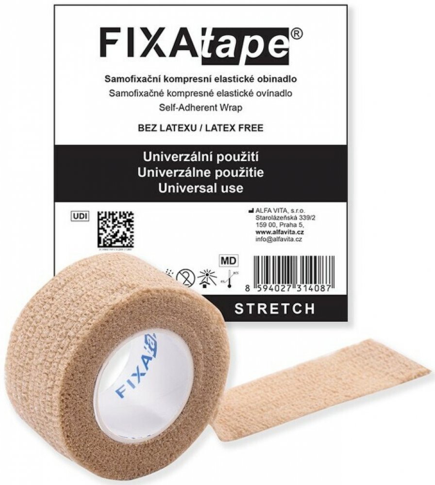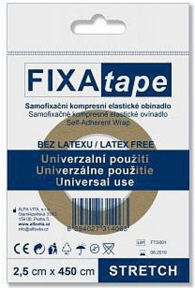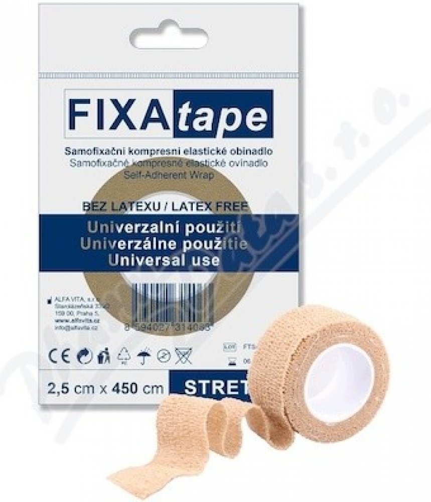 Fixatape Stretch je samofixační kompresní elastické obinadlo k univerzálnímu použití. Neobsahuje latex.Balení obsahuje obinadlo o velikosti 2,5 x 450 cm. Fotografie je pouze ilustrační. Barva produktu je dodávána podle aktuální skladové zásoby.