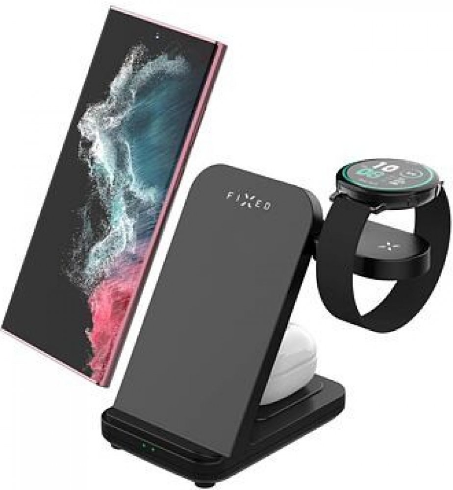 Černý nabíjecí stojánek FIXED Powerstation pro SamsungPraktický stojánek FIXED Powerstation pohodlně a bezdrátově dobije váš telefon, sluchátka i chytré hodinky Galaxy Watch najednou. Nabíjení se okamžitě spustí automaticky po přiložení vašich zařízení do stojánku. Hlavní nabíjecí plocha s výkonem až 15 W je určena pro mobilní telefon, který lze nabíjet v horizontální i vertikální poloze. Probíhající nabíjení indikuje LED dioda. Na sekundární nabíjecí ploše s 5W výkonem můžete nabíjet TWS sluchátka, další telefon i jiné zařízení kompatibilní s bezdrátovým nabíjením. Třetí nabíjecí plocha stojánku FIXED Powerstation byla přímo vyvinuta pro chytré hodinky Samsung Galaxy Watch. Adaptér lze jednoduše ze stojánku vyjmout a připojit k jiným nabíječkám. Pro zajištění optimálního výkonu je zapotřebí nabíjecí stojánek FIXED Powerstation připojit k PD adaptéru o výkonu 25 W.FIXED Powerstation nabije vaše zařízení během chvilkyTelefon se ve stojánku FIXED Powerstation dobije bleskovou rychlostí s nabíjecím výkonem až...
