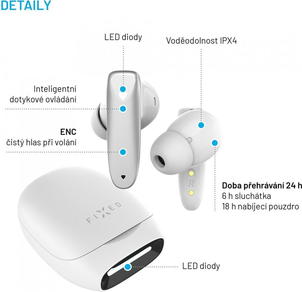 - dlouhá výdrž baterie až 24 hodin (6 hodin sluchátka + 18 hodin s nabíjecím pouzdrem)