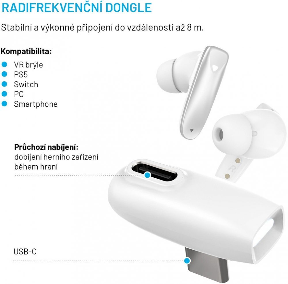 Vlastnosti:- bezdrátová herní sluchátka s radiofrekvenčním donglem