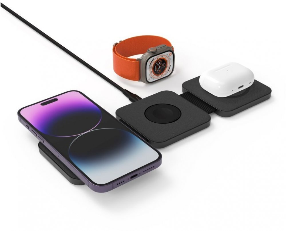 Po rozložení získáte hlavní nabíjecí plochu s podporou MagSafe, kde nabijete váš iPhone s výkonem max. 7,5 W. Ale i ostatní smartphony s bezdrátovým nabíjením a funkcí Qi o výkonu max. 15 W. Druhá plocha s integrovanou nabíječkou je speciálně vyhrazena pro Apple Watch hodinky. Na třetí ploše dobijete svá bezdrátová sluchátka nebo další telefon.