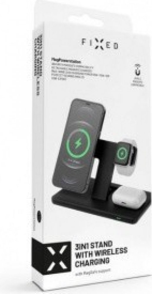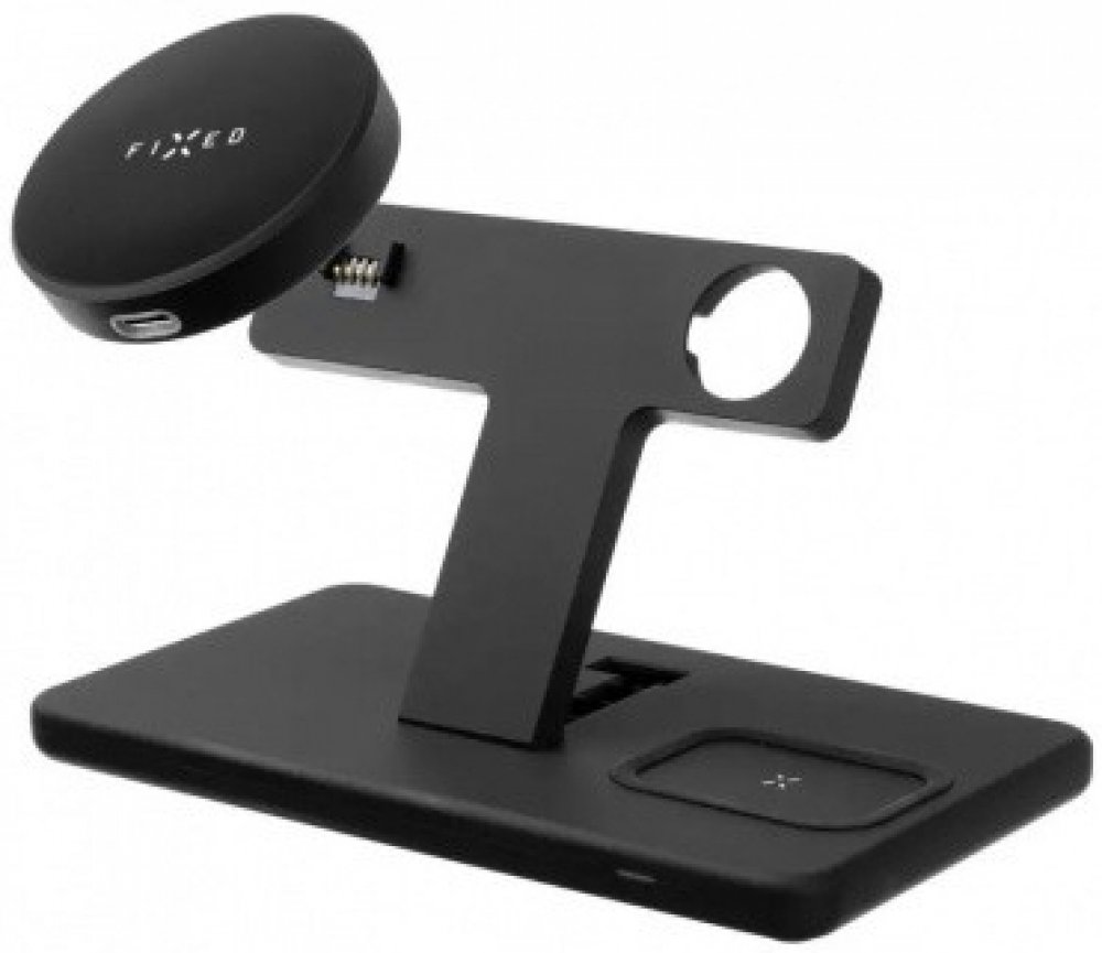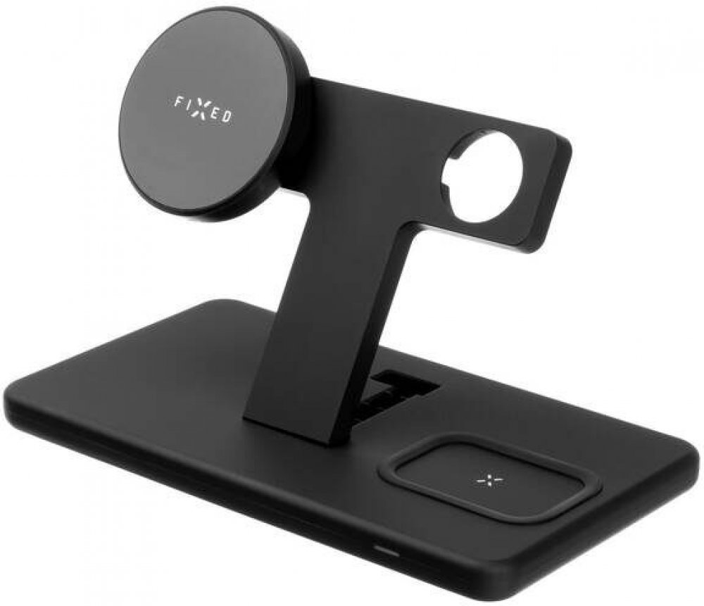 S praktickým stojánkem FIXED Powerstation pohodlně vyřešíte problém s nabíjením vašeho telefonu, sluchátek i chytrých hodinek Apple Watch najednou. Pomocí bezdrátového dobíjení se stojánek kompletně postará o doplnění energie pro vaši elektroniku, nabíjení se samo spustí okamžitě po přiložení do stojánku. Hlavní nabíjecí plocha v levé části stojánku je určena pro váš smartphone, v horní části stoj...