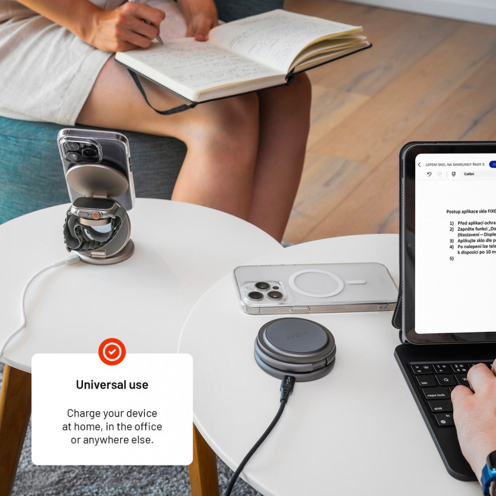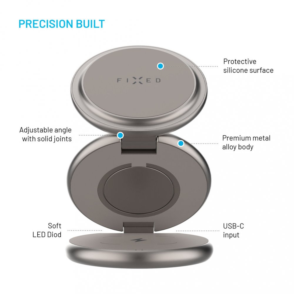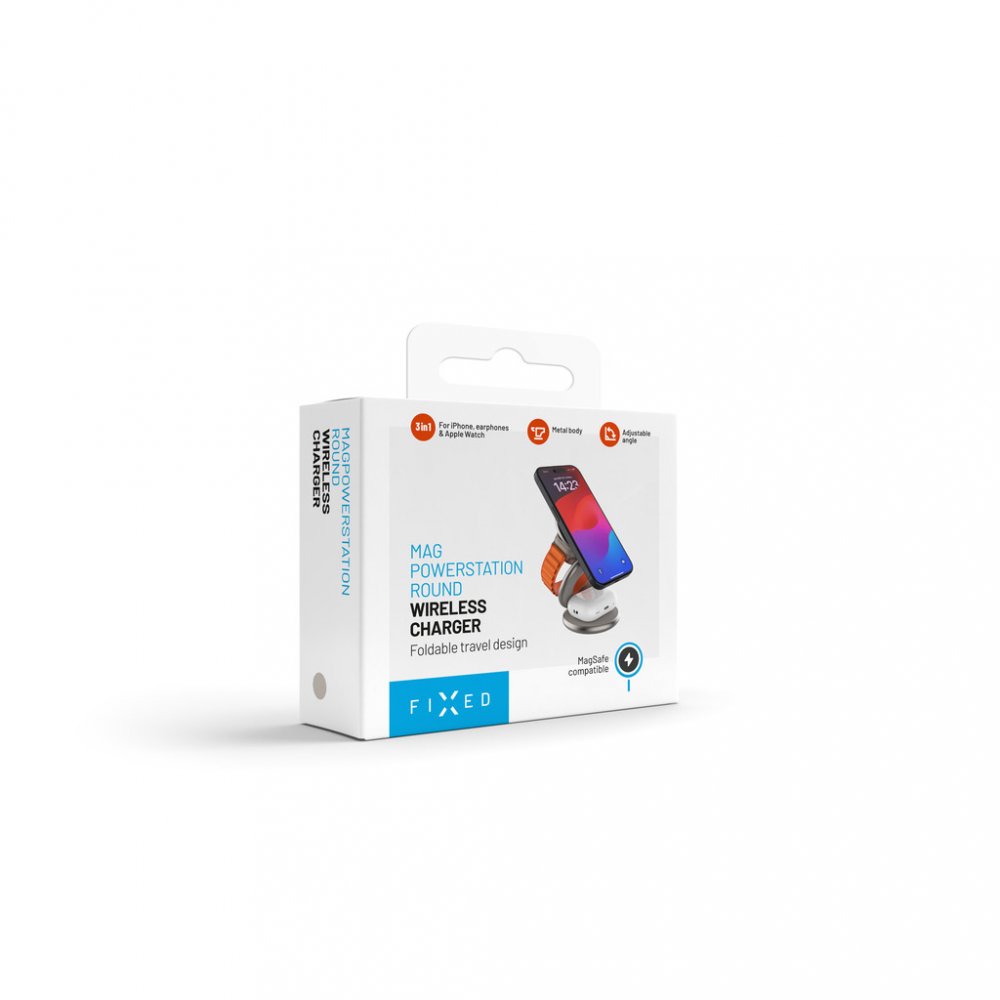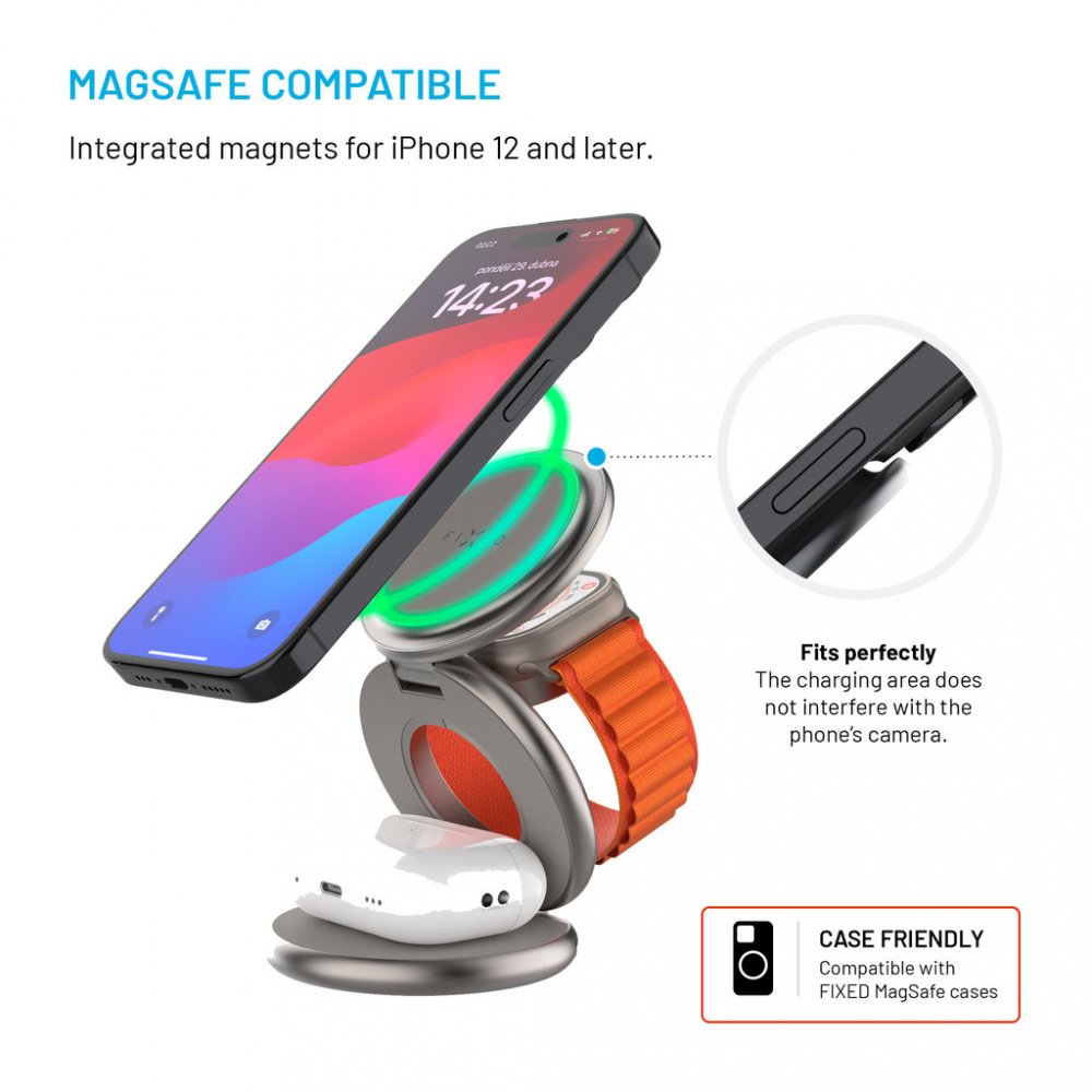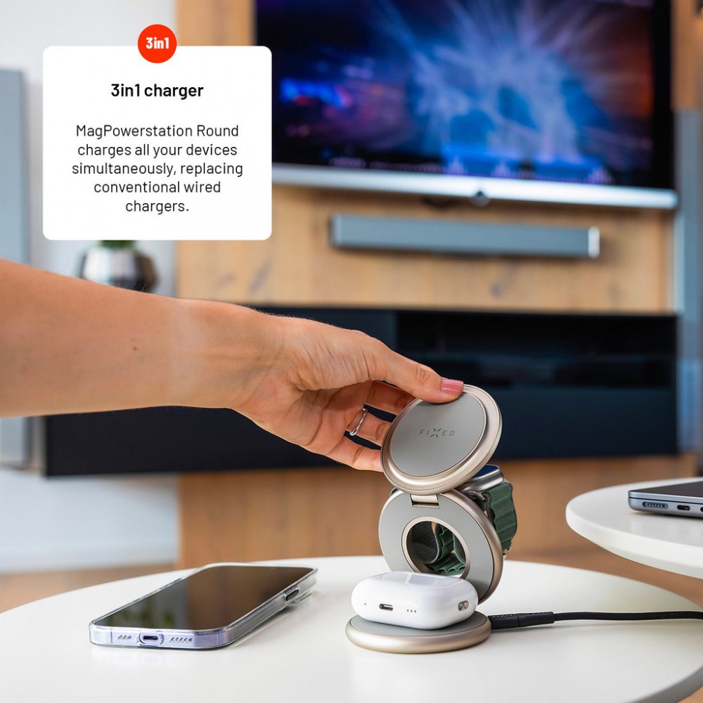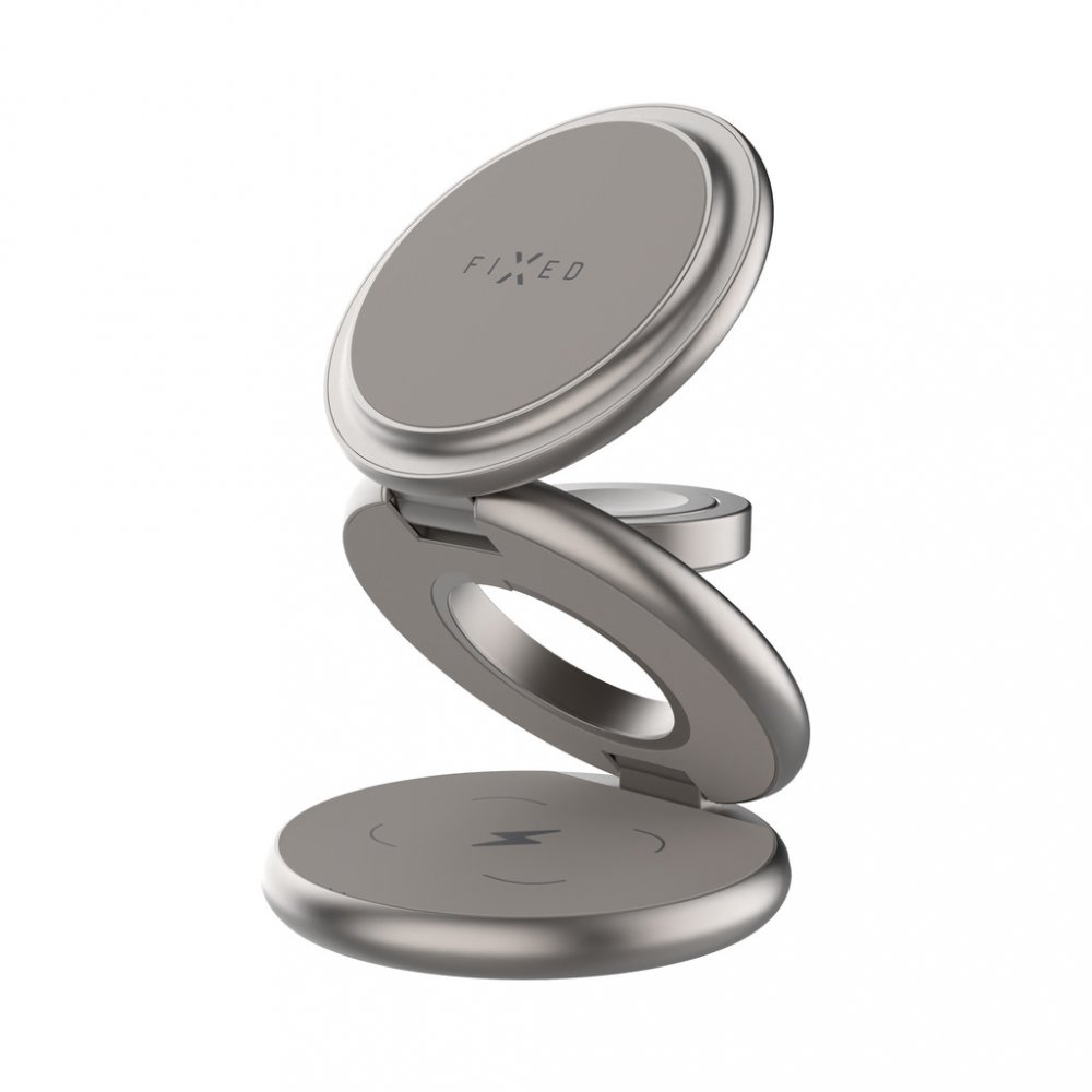 Nabíjecí stojánek FIXED MagPowerstation RoundPraktický stojánek FIXED MagPowerstation Round pohodlně a bezdrátově dobije váš telefon, sluchátka i chytré hodinky Apple Watch najednou. Nabíjení se okamžitě spustí automaticky po přiložení vašich zařízení do stojánku. Hlavní nabíjecí plocha s výkonem až 15 W je určena pro mobilní telefon, který lze nabíjet v horizontální i vertikální poloze. Probíhající nabíjení indikuje LED dioda. Na sekundární nabíjecí ploše s 5W výkonem můžete nabíjet TWS sluchátka, další telefon i jiné zařízení kompatibilní s bezdrátovým nabíjením. Třetí nabíjecí plocha stojánku FIXED MagPowerstation Round byla přímo vyvinuta pro chytré hodinky Apple Watch. Pro zajištění optimálního výkonu je zapotřebí nabíjecí stojánek FIXED MagPowerstation Round připojit k PD adaptéru o výkonu 25 W. Klíčové vlastnosti nabíjecího stojánku FIXED MagPowerstation Round s podporou MagSafe 15W+5W+5W Titan EditionStojánek s bezdrátovým nabíjením pro 3...