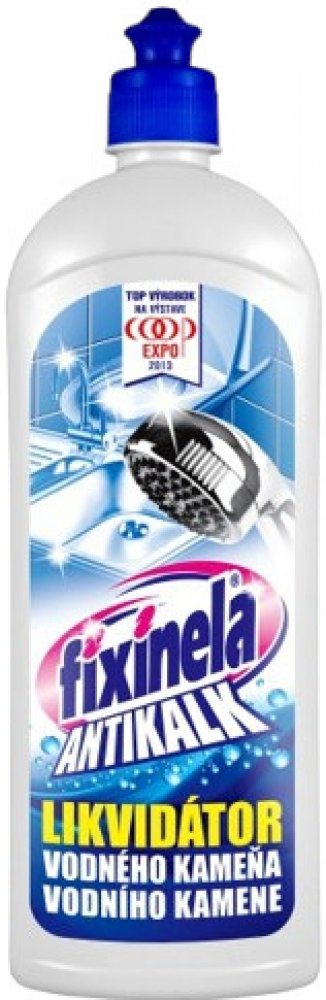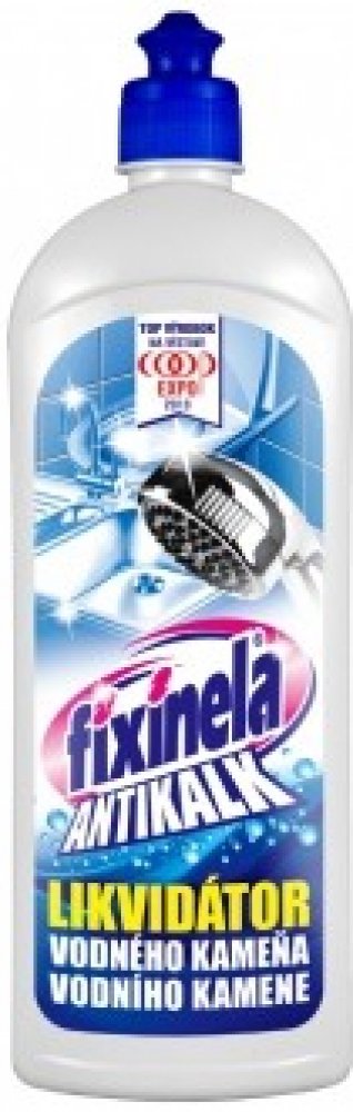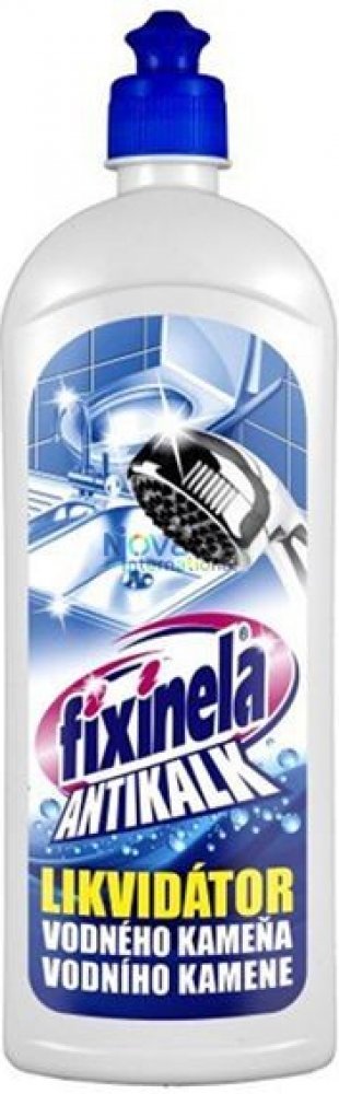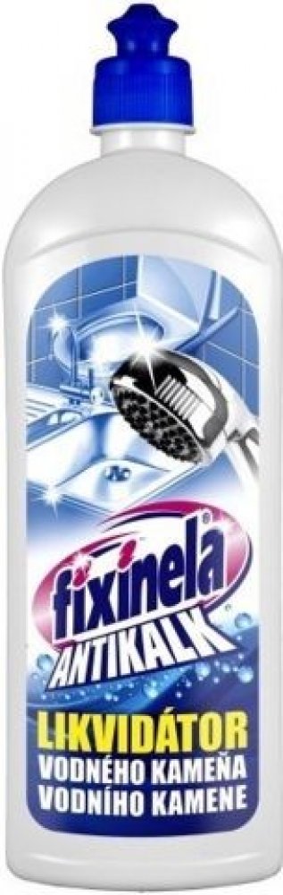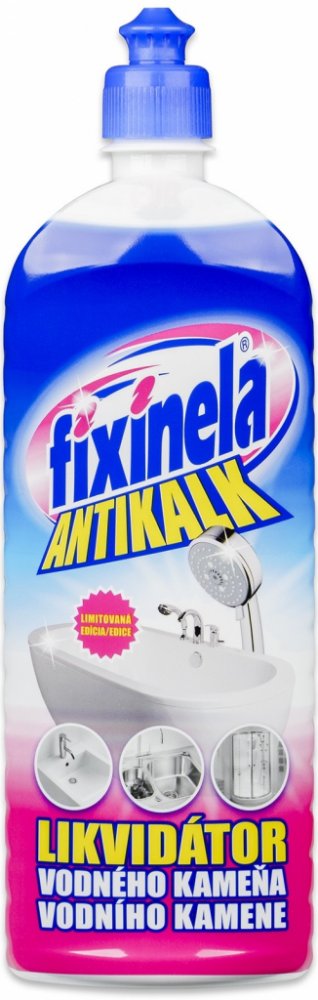 Fixinela Antikalk kyselý čistící prostředek na umyvadla, vany, sprchové kouty, výlevky, vodovodní baterie, WC mísy, obkladačky, keramické dlaždice, nerezové dřezy. Odstraňuje vodní kámen, mýdlové usazeniny, rez. Zanechává dokonalou čistotu. Pozor! Nepoužívejte na vany s poškozeným smaltem a na hliníkové předměty. Nepoužívejte společně s výrovky obsahujícími aktivní chlór.