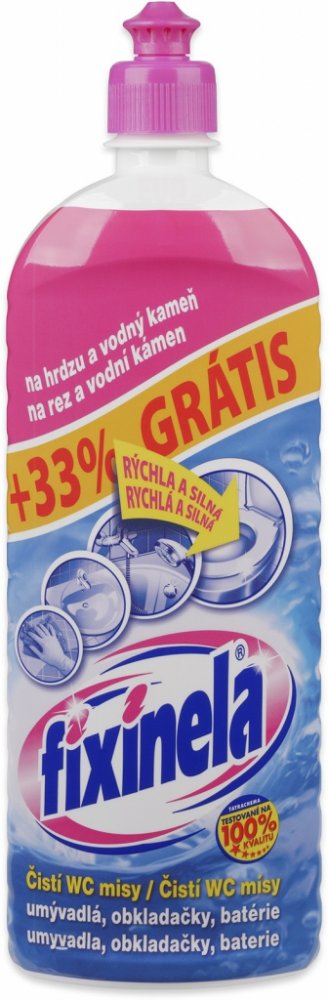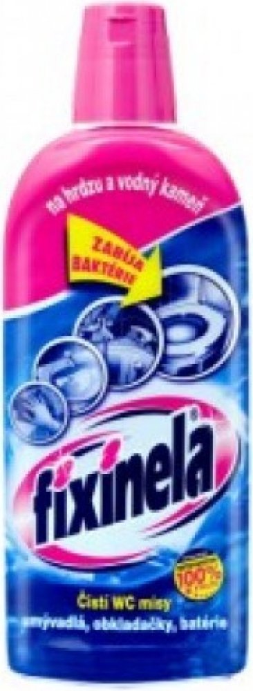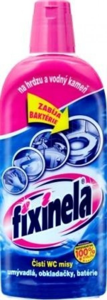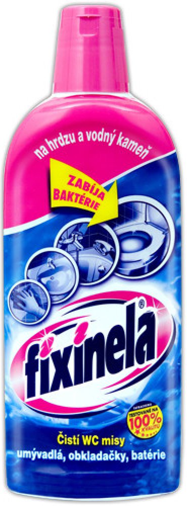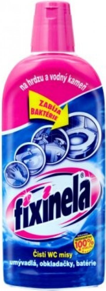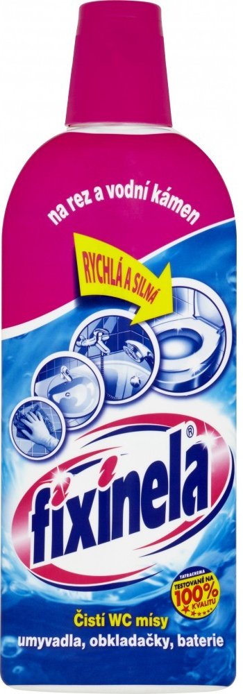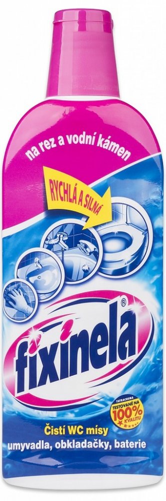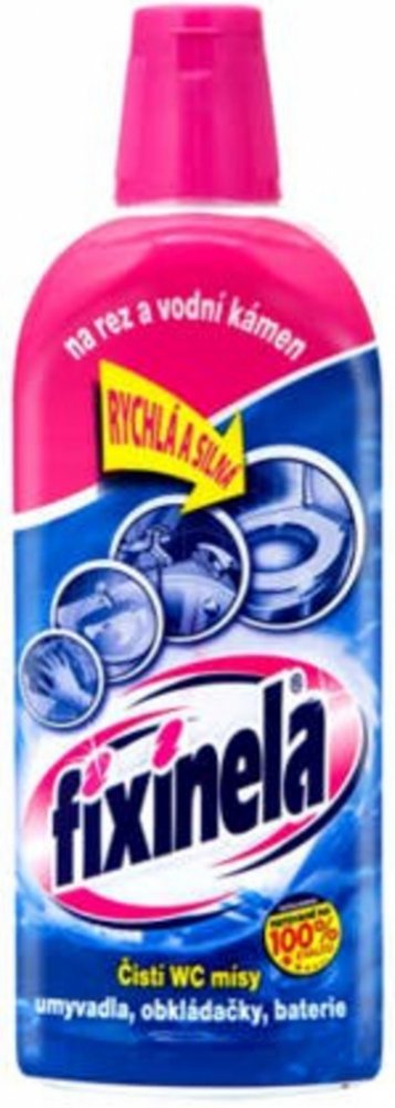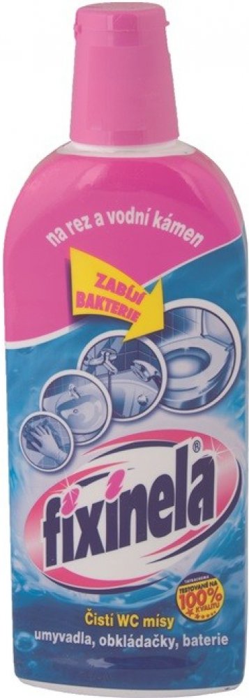 Tekutý čisticí prostředek FIXINELA je vysoce účinný kyselý čistič na umyvadla, vany, obkladačky, vodovodní baterie a WC mísy. Dokáže odstranit rez, vodní i močový kámen a další usazeniny. Poradí si i s velmi znečištěnými plochami, ničí choroboplodné zárodky. FIXINELA odstraní rychle a bez drhnutí z povrchu čištěných předmětů odolné nečistoty.