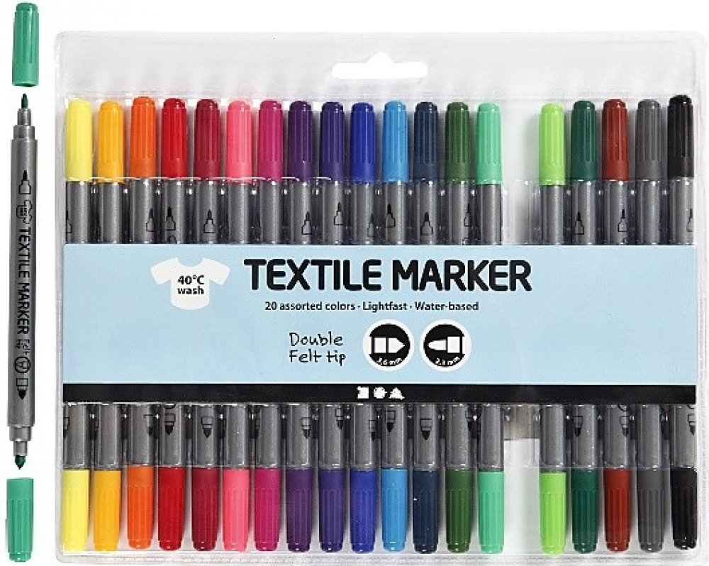Fixy na textil - popisovače - sada 20ksNa většinu textilií, nevypratelné, světlostálé a syté barvy, na vodní bázi - SKLADUJTE VE VODOROVNÉ POLOZE.Po nakreslení motivu doporučujeme pořádně přežehlit z opačné strany, abyste motiv zafixovali. Textil perte při 40°C.Tloušťka hrotu: 3,6mm a 2,3mm