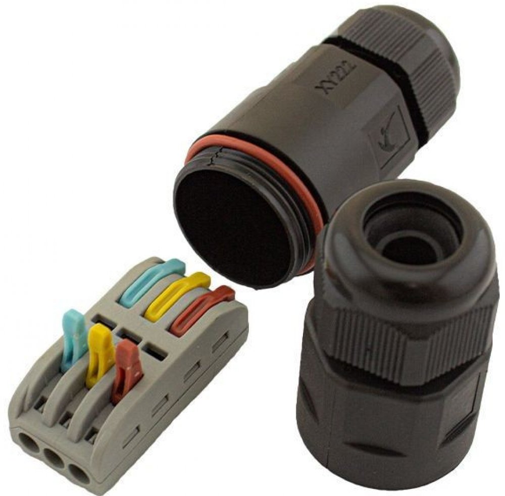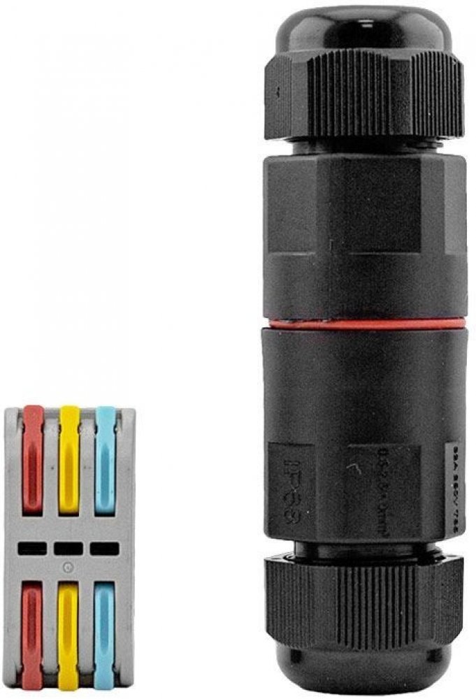 Kabelová bezšroubová spojka ve tvaru "I" pro příme spojení vodičů max. 3x2,5 mm. Kabelová vodotěsná spojka pro vícežilové kabely s krytím IP68. Vhodná pro venkovní použití, např. pro připojení LED reflektorů nebo pro spojení přeseknutých kabelů. Spojka je s kabelem zcela uzavřena (IP68), dovnitř tedy nepronikne voda ani částice prachu.