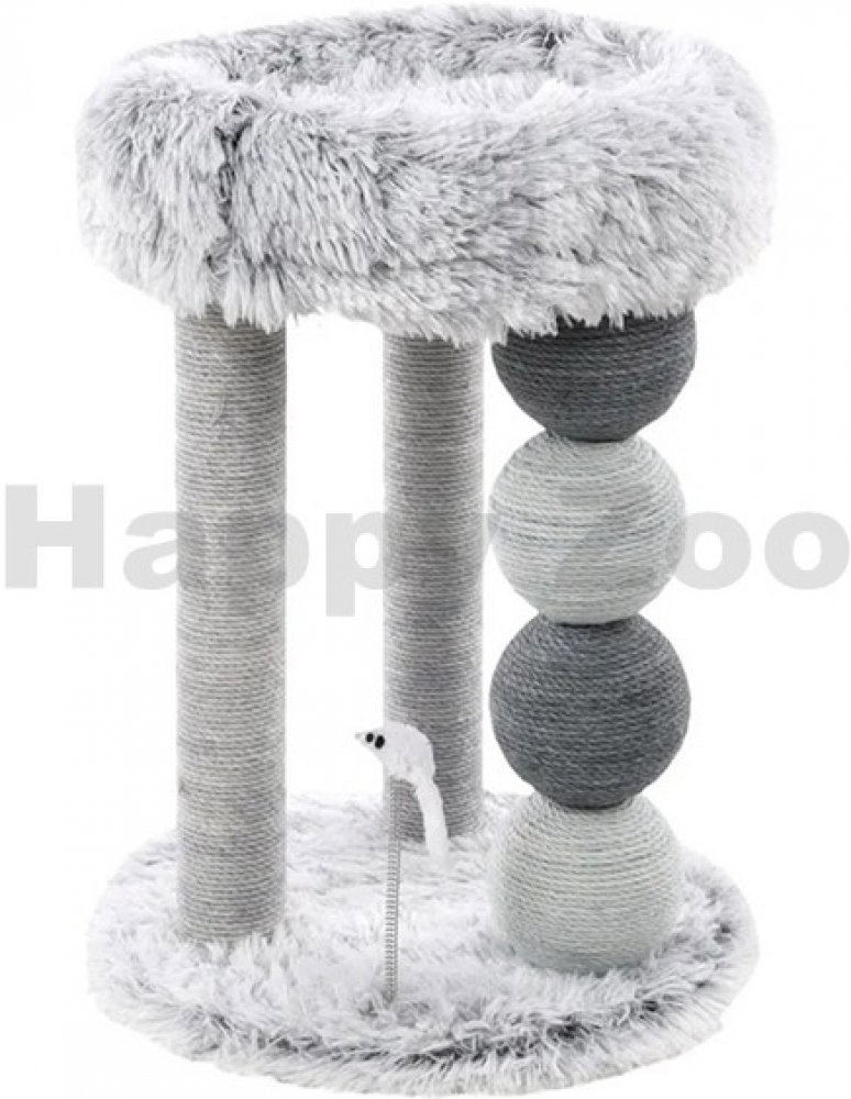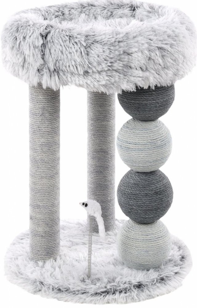 Škrabadlo střední velikosti pro kočky šedé barvy s pelíškem na odpočívání. Škrabadlo obsahuje polstrovanou plošinu. Platforma je ve spodní části potažená látkou. Obsahuje kuličky pro aktivnější hru vaší kočky.