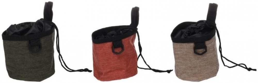Kapsa na pamlsky je vyrobená z polyesterové tkaniny a uzavíratelná stahovací šňůrkou. Má klip k připevnění například ke kapse a kroužek na připnutí doplňků. Díky vodoodpudivému materiálu je ideální na procházky i trénink v terénu se psem. Pamlskovník lze prát v ruce na 30 °C.