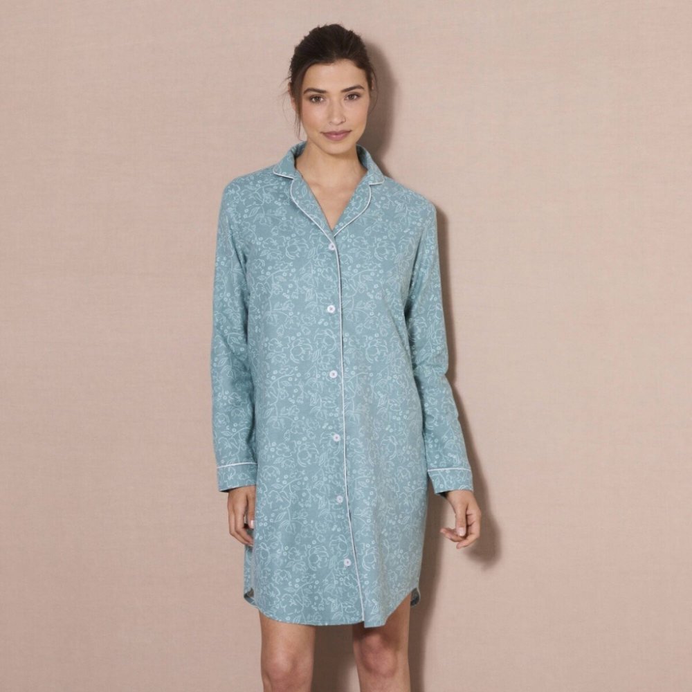Nechte se okouzlit jemností flanelové noční košile s potiskem květin! Rovný střih. Kostýmkový elegantní límeček. Kontrastní lem výstřihu, předního dílu a manžet. Vpředu celopropínací na knoflíky. Dlouhé rukávy. Zakulacený košilový spodní lem vpředu a vzadu. Bavlněný jemný flanel. Standard 100 podle Oeko-Tex (n° CQ 1216 / 3 IFTH). Tato známka označuje textilní výrobky, které byly podrobeny laboratorním testům na široké spektrum škodlivých látek a výrobek je bezpečný nad rámec platných norem. Lze prát v pračce.