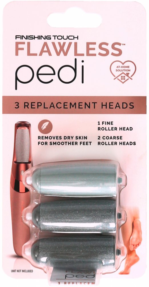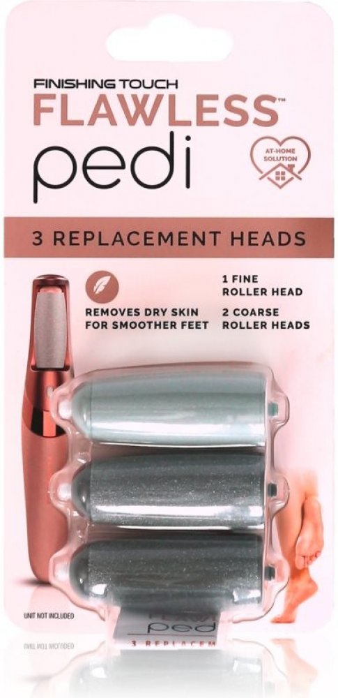 Flawless náhradní hlavice Finishing Touch Pedi obsahují dvě hrubé válečkové hlavice k odstranění mozolů a odumřelé kůže a 1 jemnou hlavici pro zaleštění a každodenní údržbu. Náhradní hlavice jsou kompatibilní pouze s Flawless Finishing Touch Pedi.