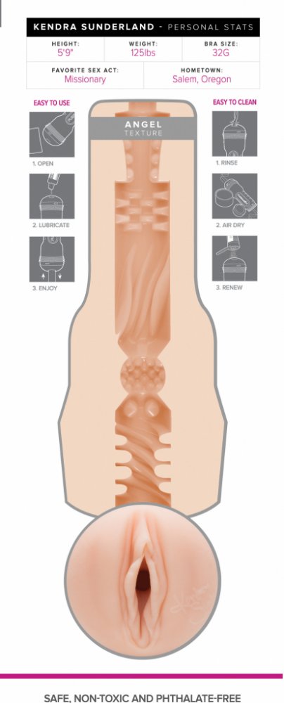 Tato umělá vagina je originální otisk vaginy Kendry Sunderland, talentované a charismatické pornostar ověnčené titulem VIXEN Angel of the Year 2017. Působivá textura vnitřní vložky umělé vaginy s řadou stimulačních drážek a výstupků působí jako malý zázrak a při použití ve vás vyvolá pocit, že jste opravdu ve spojení se samotným andělem.