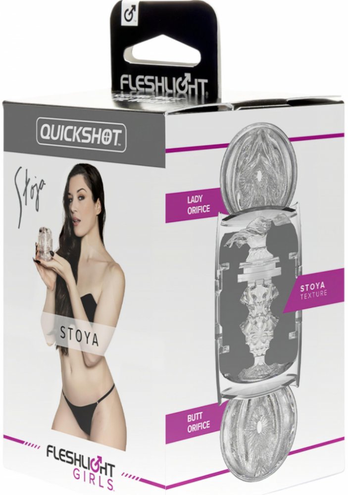 Malý a snadno ovladatelný masturbátor Quickshot Stoya od Fleshlight je umístěn v průhledném, dobře uchopitelném pouzdře s ochranným víčkem. Obě strany masturbátoru jsou použitelné: jedna je tvarována jako vagína a druhá jako anál. Tyto konce jsou realistickými replikami intimních partií erotické hvězdy Stoya, která dokonce na obal přidala svůj autogram.