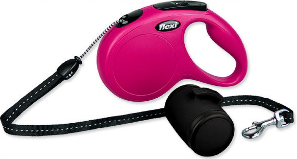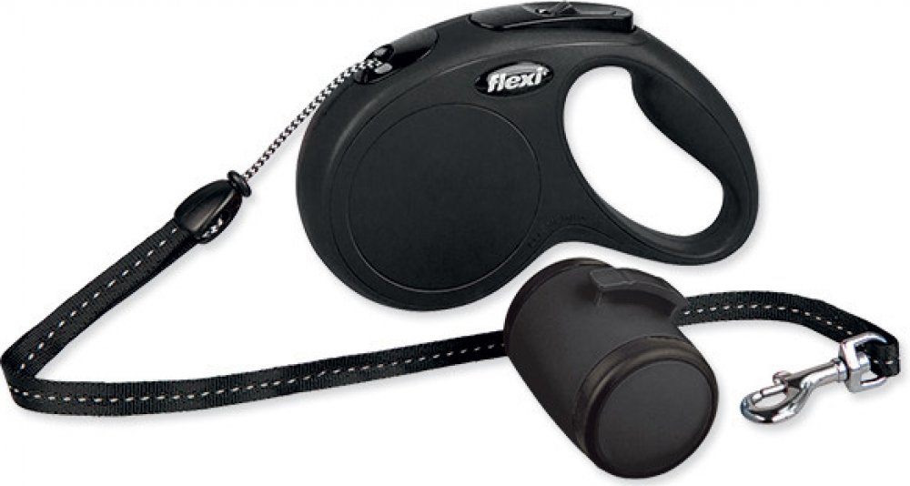Samonavíjecí lankové vodítko s boxem na igelitové sáčky pro střední plemena psů do hmotnosti 20 kg.Délka: 5 m, hmotnost 230 g.