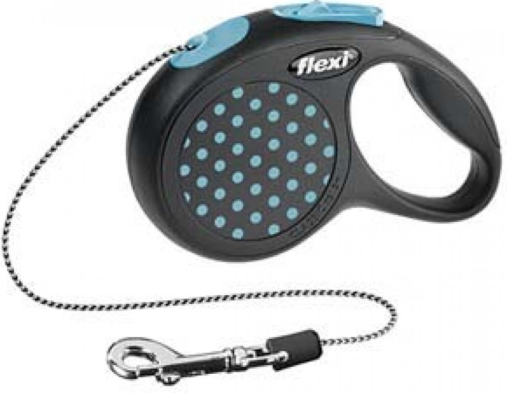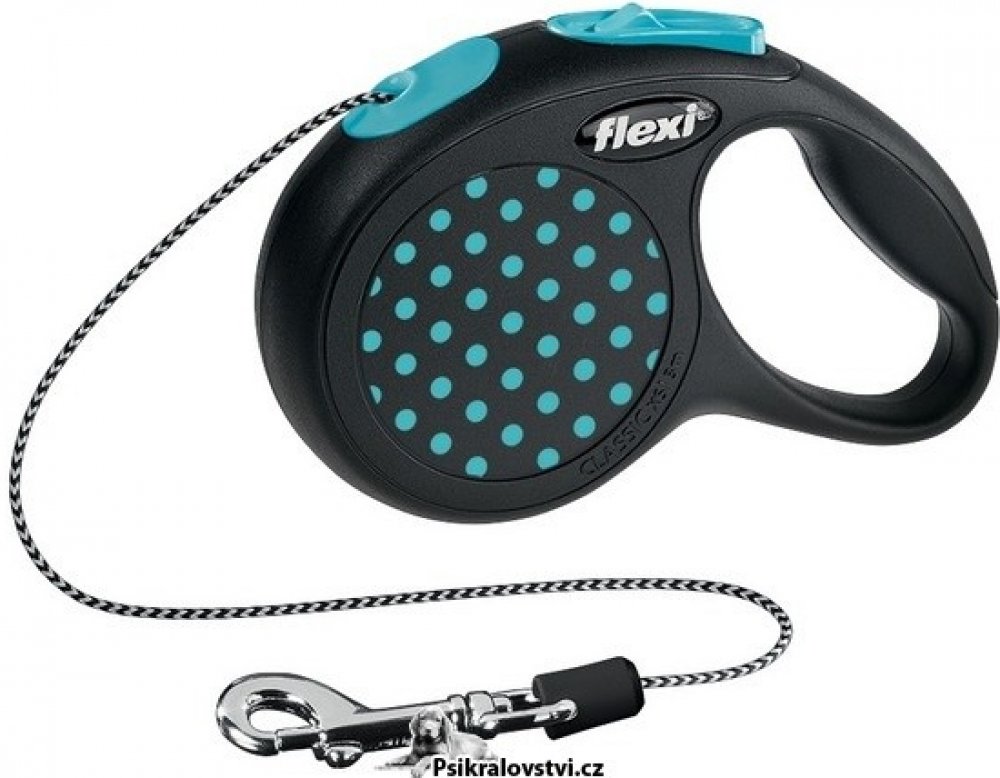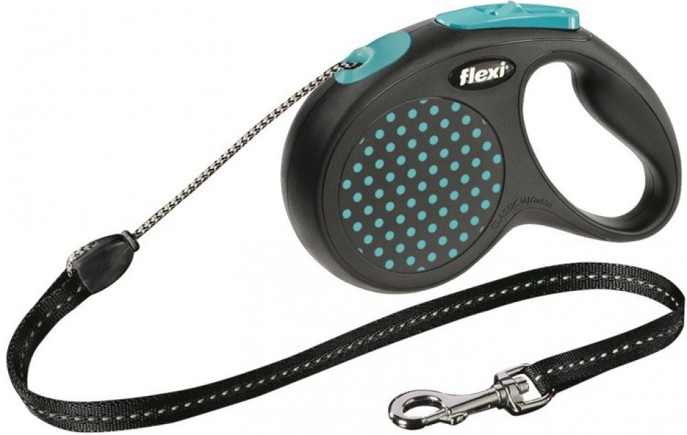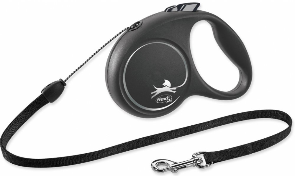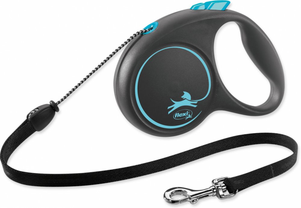 Samonavíjecí vodítko s lankem Flexi® Design v černé barvě s modrými prvky je vhodné pro středně velké psy o hmotnosti do 20 kg.