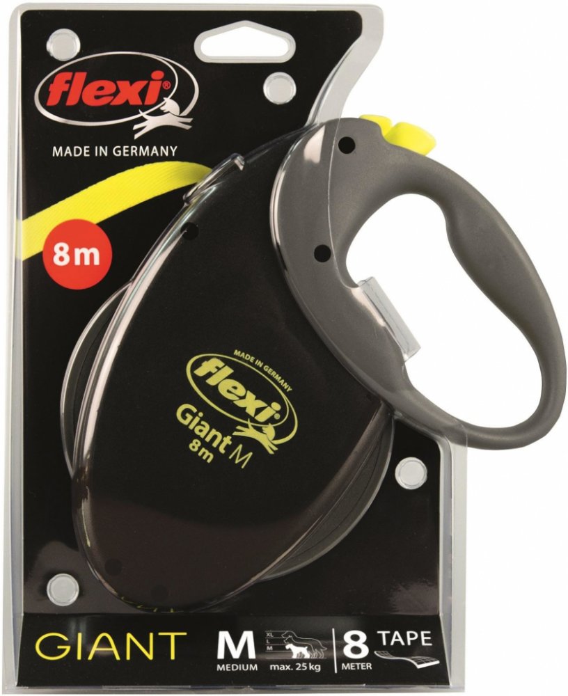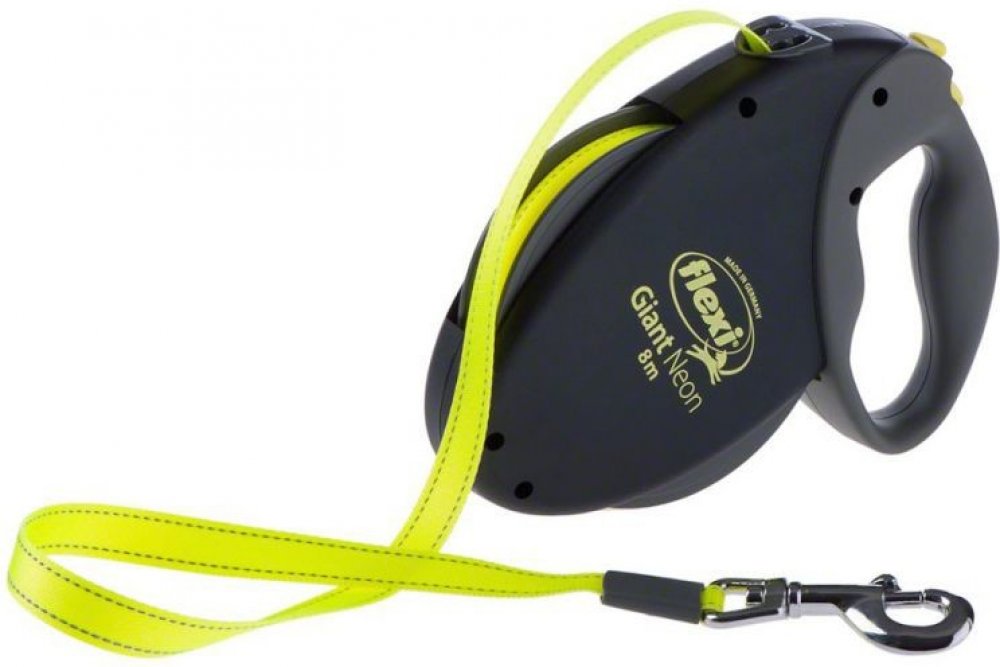 Samonavíjecí vodítko Flexi z řady Giant je vyhotoveno v jednoduchém černém provedení s neonovými detaily v podobě brzdy, loga a pásku. Vodítko pro psy Flexi disponuje brzdným systémem, který ve zlomku vteřiny zastaví pohyb pásku. Pro snadné upevnění vodítka k obojku nebo postroji je na konci pásku chromovaná karabinka. Neonový pás na vodítku Giant je extrémně dlouhý a velmi dobře viditelný.