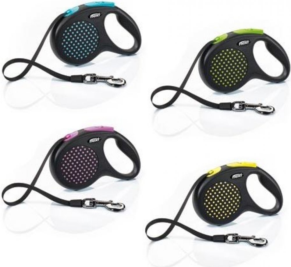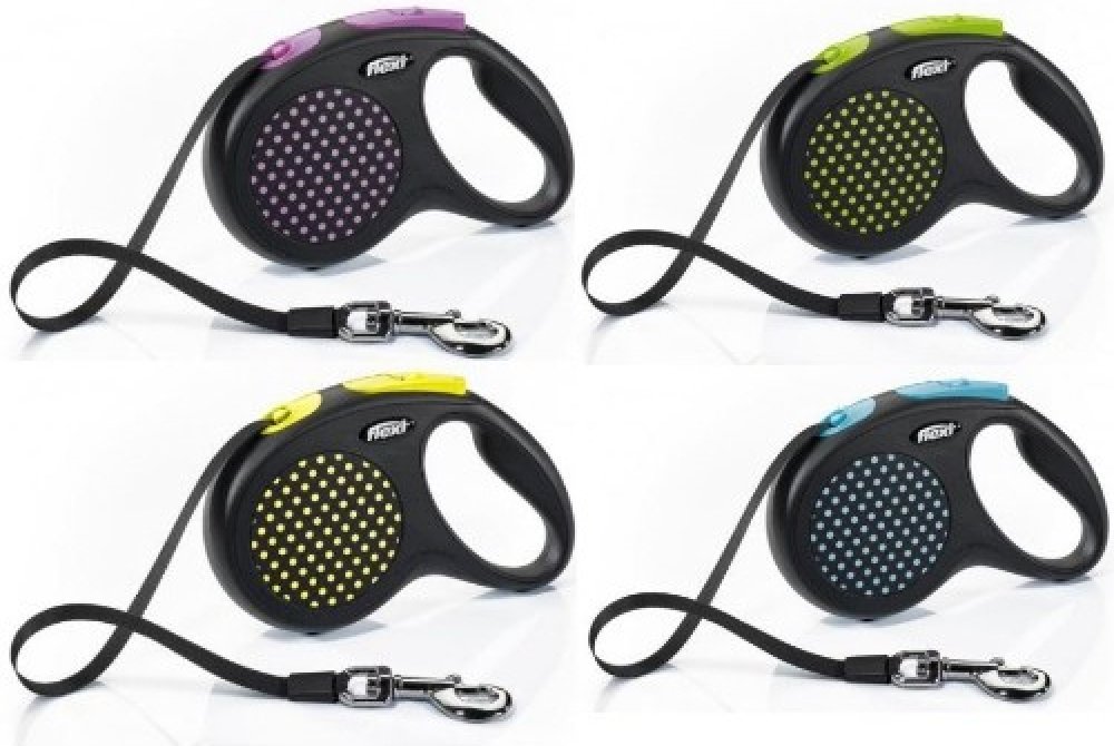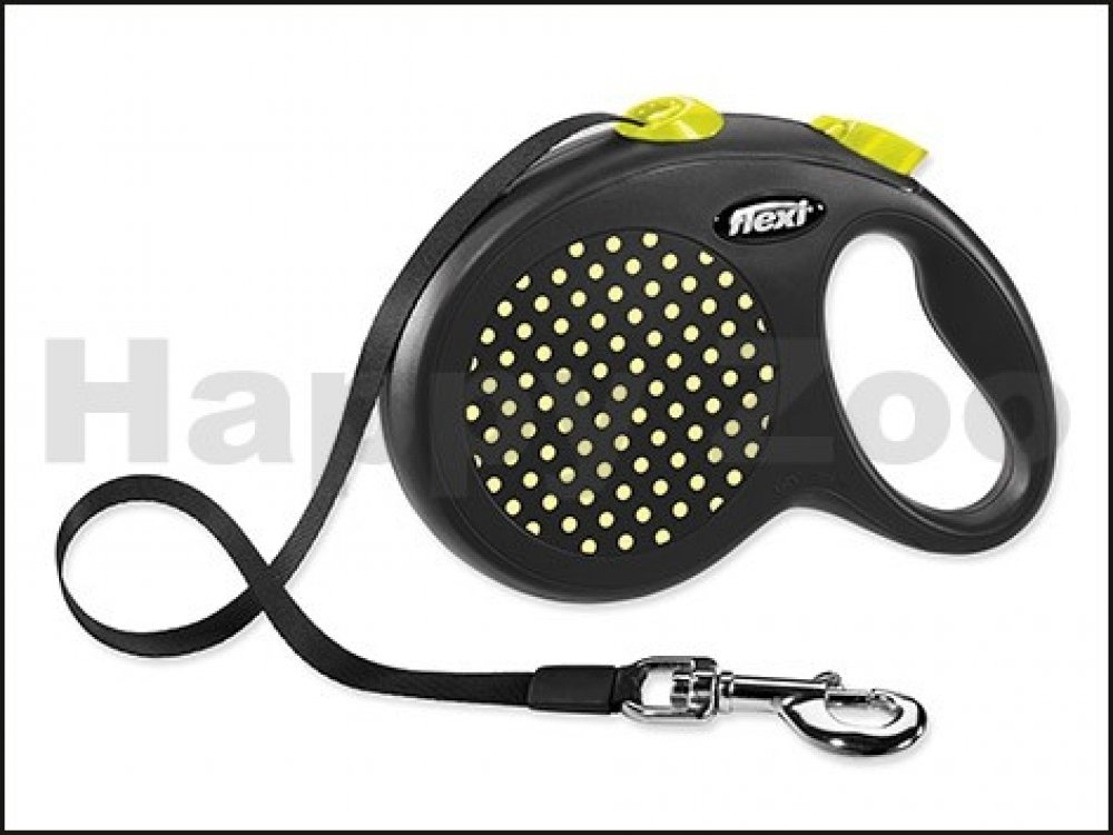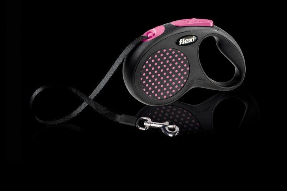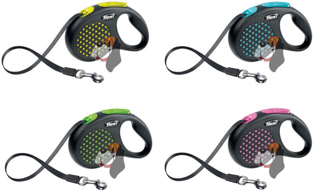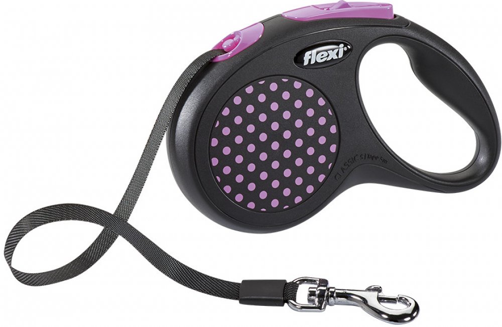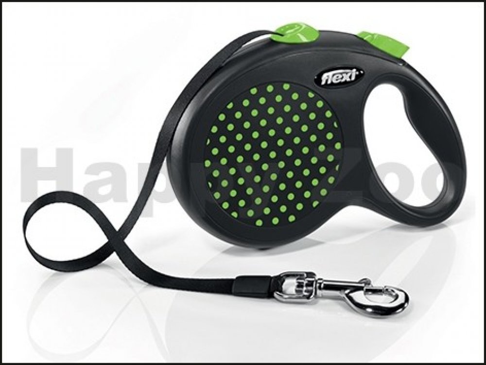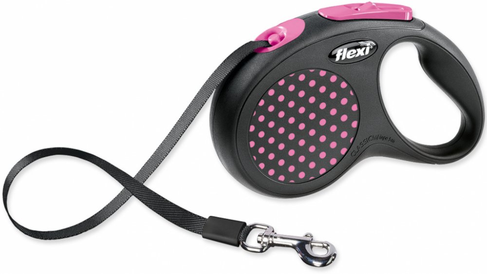 Samonavíjecí vodítko Flexi z řady Design je v černém provedení a barevnými puntíky. Ve stejném barevném provedení jsou vyhotovené i detaily v podobě brzdy a vyjíždění pásku. Vodítko pro psy Flexi disponuje jednoduchým brzdným systémem, který ve zlomku vteřiny zastaví pohyb pásu. Pro snadné upevnění vodítka k obojku nebo postroji je na konci pásku chromovaná karabinka. Na spodní část vodítek Flexi pod rukojeť) lze připevnit praktický box, díky kterým budete mít stále při ruce pamlsky nebo sáčky na exkrementy. Tento box není součástí balení s vodítkem.