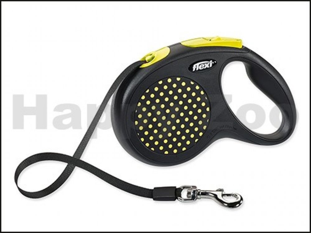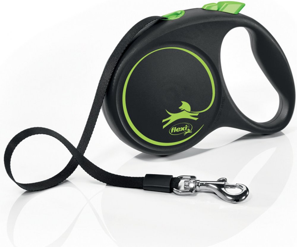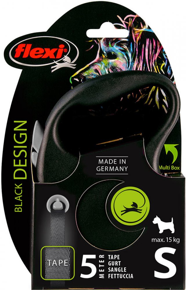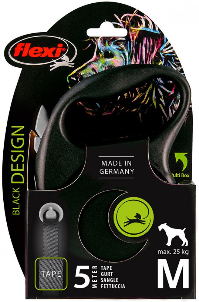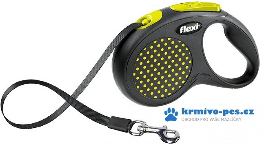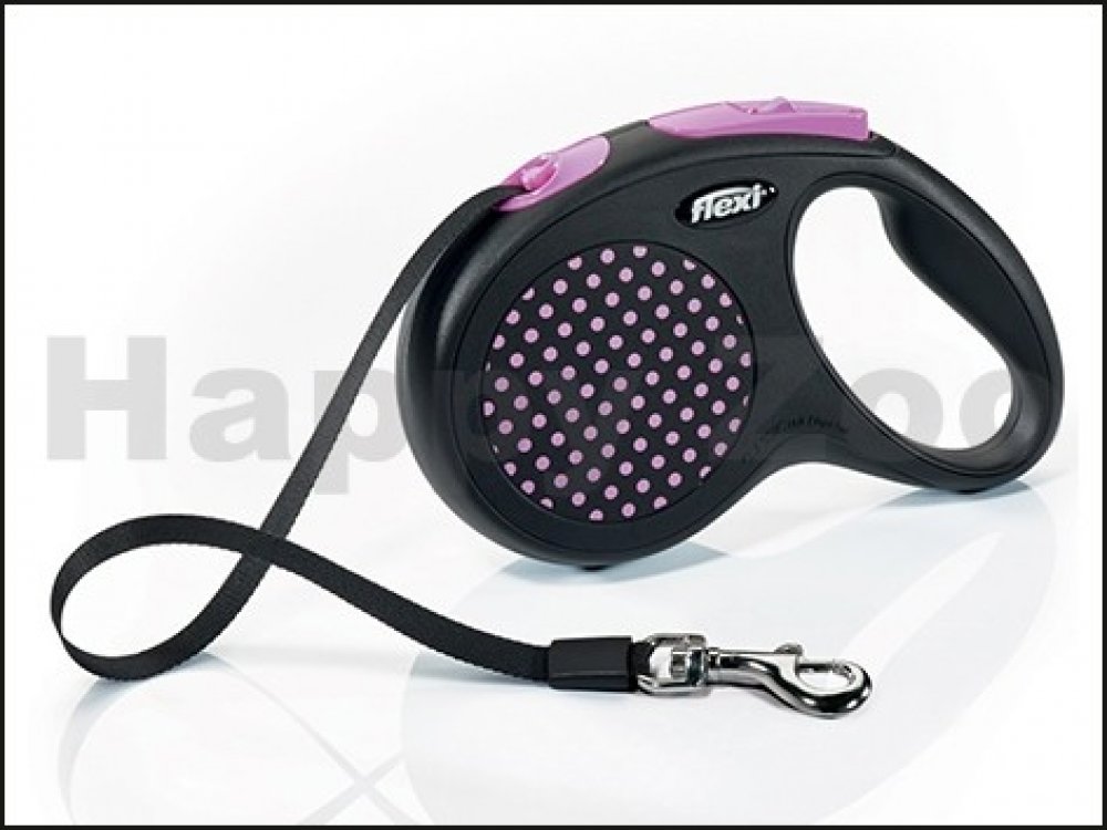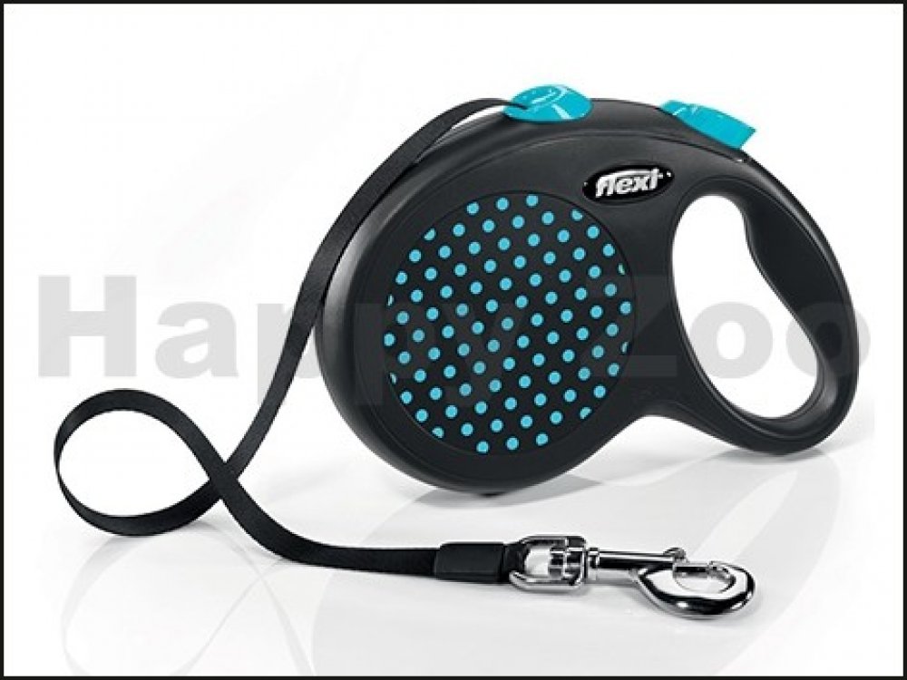 Samonavíjecí vodítko Flexi z řady Design je v černém provedení a barevnými puntíky. Ve stejném barevném provedení jsou vyhotovené i detaily v podobě brzdy a vyjíždění pásku. Vodítko pro psy Flexi disponuje jednoduchým brzdným systémem, který ve zlomku vteřiny zastaví pohyb pásu. Pro snadné upevnění vodítka k obojku nebo postroji je na konci pásku chromovaná karabinka. Na spodní část vodítek Flexi pod rukojeť) lze připevnit praktický box, díky kterým budete mít stále při ruce pamlsky nebo sáčky na exkrementy. Tento box není součástí balení s vodítkem.