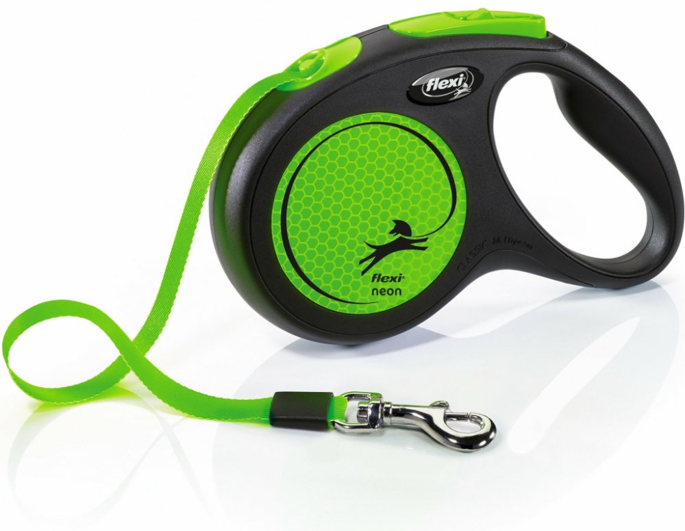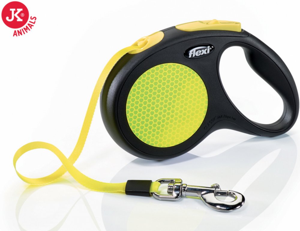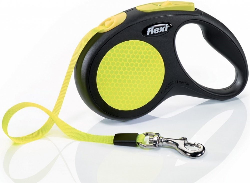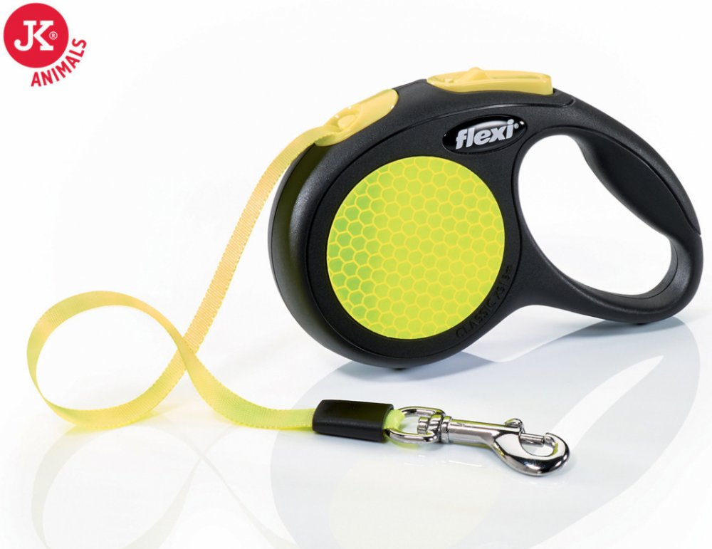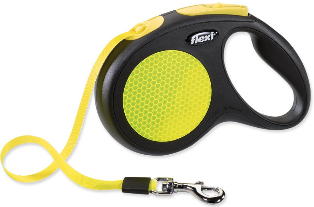 Samonavíjecí vodítko Flexi z řady NEON NEW je vyrobené v černém provedení s neonovými detaily (brzda, vyjíždění pásku, pásek a boční strana s logem). Vodítko pro psy Flexi disponuje jednoduchým brzdným systémem, který ve zlomku vteřiny zastaví pohyb pásku. Pro snadné upevnění vodítka k obojku nebo postroji je na konci popruhu chromovaná karabinka. Reflexní samolepka na boku vodítka odráží světlomety na vzdálenost až 150 m, což zvyšuje bezpečnost při venčení za šera nebo tmy. Dalším reflexním prvkem je neonový pásek. Pod rukojeť vodítek Flexi Neon lze připevnit praktický box, díky kterému budete mít stále při ruce pamlsky nebo sáčky na exkrementy. Tento box není součástí balení s vodítkem.
