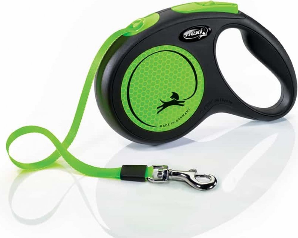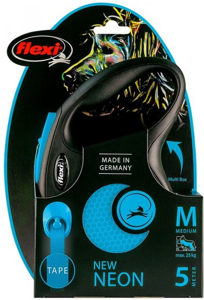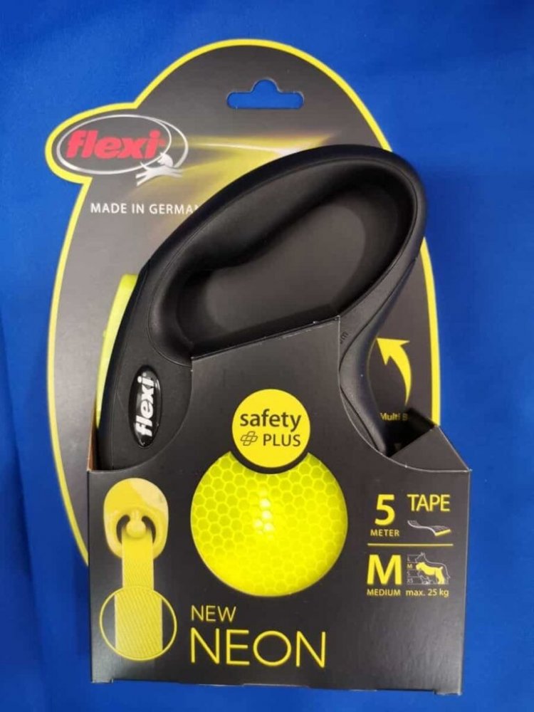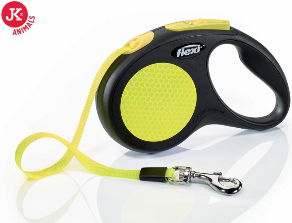 Samonavíjecí vodítko Flexi z řady NEON NEW je vyrobené v černém provedení s neonovými detaily (brzda, vyjíždění pásku, pásek a boční strana s logem). Vodítko pro psy Flexi disponuje jednoduchým brzdným systémem, který ve zlomku vteřiny zastaví pohyb pásku. Pro snadné upevnění vodítka k obojku nebo postroji je na konci popruhu chromovaná karabinka. Reflexní samolepka na boku vodítka odráží světlomety na vzdálenost až 150 m, což zvyšuje bezpečnost při venčení za šera nebo tmy. Dalším reflexním prvkem je neonový pásek. Pod rukojeť vodítek Flexi Neon lze připevnit praktický box, díky kterému budete mít stále při ruce pamlsky nebo sáčky na exkrementy. Tento box není součástí balení s vodítkem.