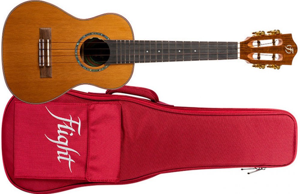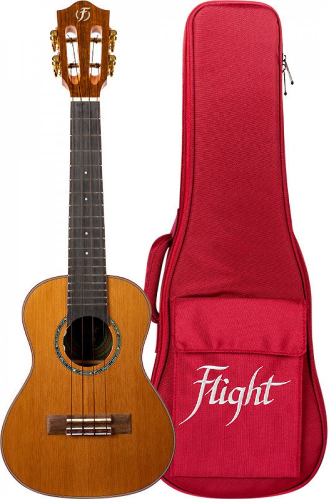 Elektroakustické ukulele Řada Princess Series značky Flight představuje polomasivní akustické a elektroakustické modely ukulelí s řadou zajímavých designových prvků. Modely Victoria, Sophia, Leia a další jsou dodávány ve stylovém červeném gig bagu s 15 mm polstrováním. Přední deska koncertního ukulele Diana je zhotovena z masivního cedru, zadní deska a luby z laminovaného mořeného ořechu, jehož kresba pěkně kontrastuje s cedrovým topem. Ke krku z okoumé je přilepen hmatník ze dřeva purpleheart osazený osmnácti pražci. Struny jsou přes sedlo a nultý pražec z kosti uchyceny v hlavici v klasickém designu (slotted headstock). Pěkné zpracování podtrhuje lesklý lak těla, oboustranná obvodová lemovka, perleťová rozeta a hardware ve zlatém provedení. Možnost ozvučení nabízí aktivní elektronika Double B1U s ovladači Volume a Tone decentně zasazenými do ozvučnicového otvoru nástroje. Slovinská značka Flight je dalším zajímavým pojmem na poli výrobců ukulelí. Nabízí široké spektrum těchto populárních kompaktních nástrojů v klasických i méně tradičních tvarech a standardních velikostech. Začínající hráče a tuláky s muzikantskou duší potěší kvalitně zpracované cenově dostupnější modely ukulelí zhotovené z klasických i exotických dřevin v přírodních a barevných úpravách, nebo cestovní modely ukulelí z řady Travel Series s tělem z odolného plastu. Zkrátka nepřijdou ani náročnější muzikanti a profi hráči, kteří mohou vybírat ze špičkově zpracovaných polo/celomasivních modelů elektroakustických ukulelí.