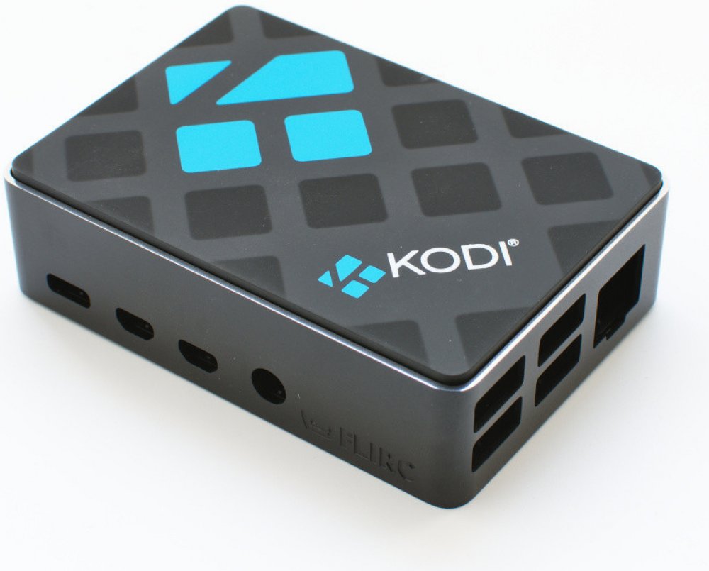 Nejnovější verze hliníkového pouzdra od společnosti FLIRC s logem Kodi.