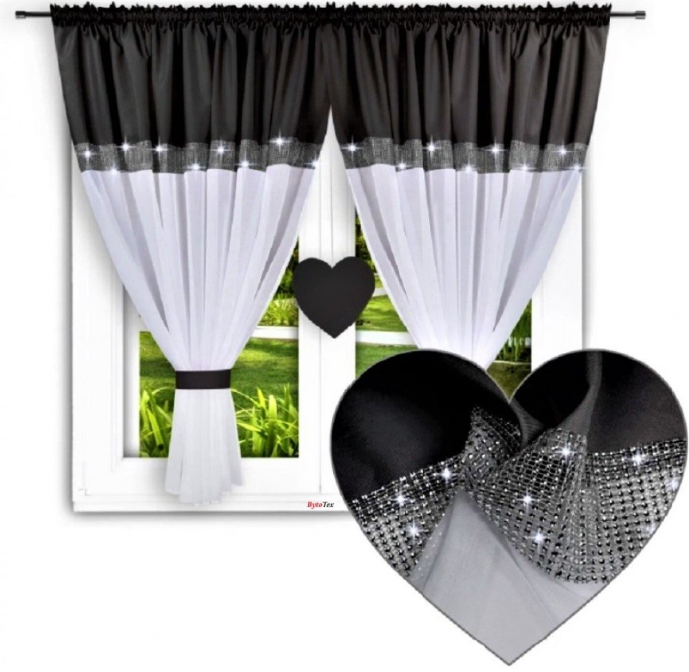 Fliying Hotová záclona s řasící páskou Srdíčka bílá/černá 400x145 cm