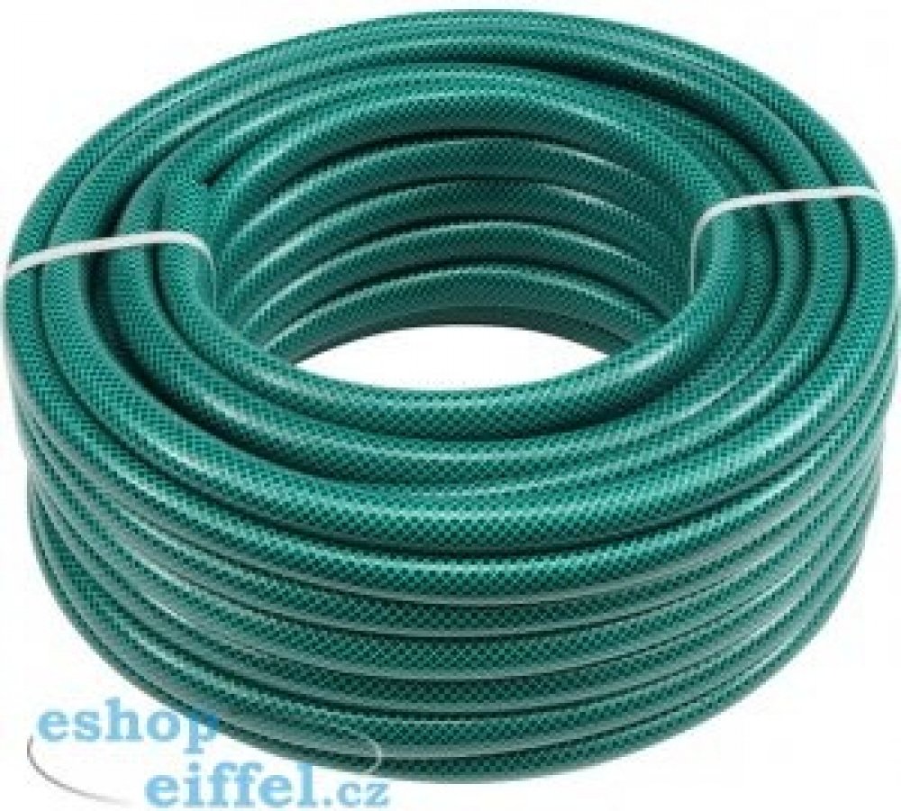Třívrstvá zahradní hadice z pružného plastu a polyesterovým, příčným opletem. Odolná vůči stárnutí a usazování nečistot. Hadice je pružná i při nízkých teplotách.