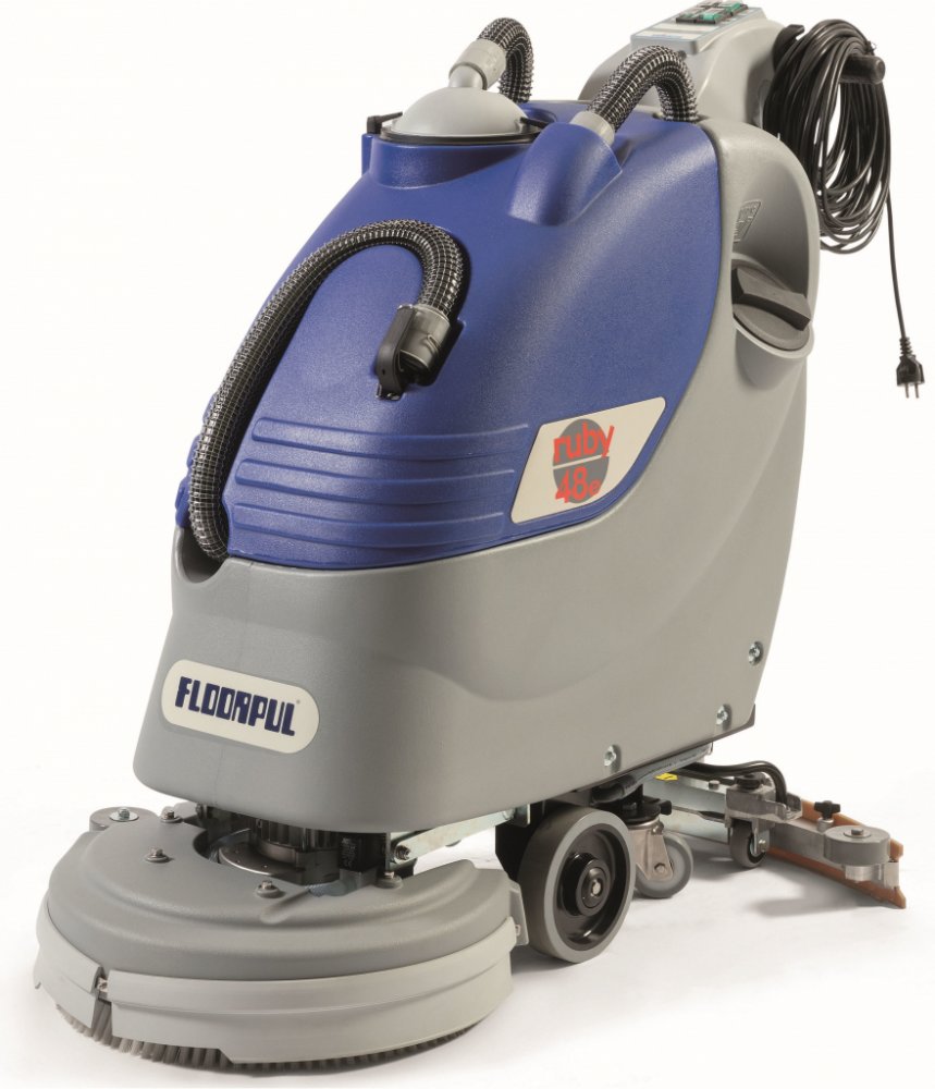 Podlahový čisticí stroj RUBY 48E je kvalitní a spolehlivý podlahový mycí stroj s pracovním záběrem 485 mm. Stroj je dodáván jako jednokartáčový (kartáč 19") vybavený semi pojezdem, tj. pojezd za pomocí rotace kartáče. Díky své kvalitě, robustnosti a kvalitnímu dílenskému zpracování je vhodný pro úklid všech typů podlah. Systém jednoho kartáče vytváří vynikající mycí účinek díky silnému rozrušování nečistot rotací kartáče. Díky optimálním otáčkám a promyšlené konstrukci se opotřebení kartáče projevuje velmi pomalu, často v řádu několika let používání (nízké provozní náklady). Parabolická sací lišta zajišťuje vynikající odsávání nečistot z povrchu. Mycí stroj je vhodný pro úklid Vaší firmy, školy, hotelu, výrobního závodu nebo pro skladovací halu, své uplatnění najde i do náročných průmyslových objektů