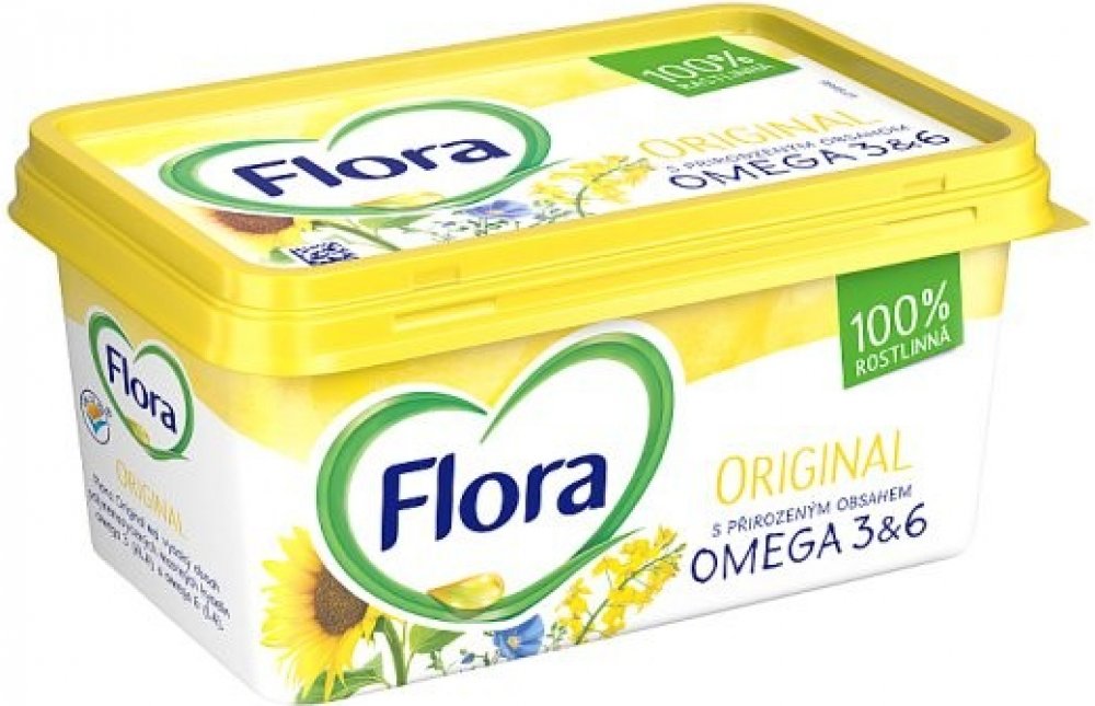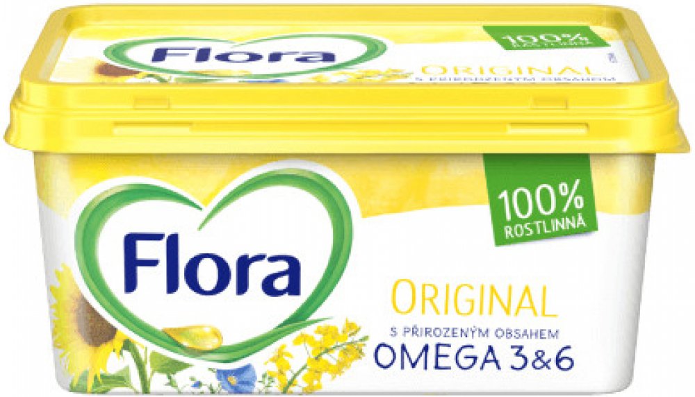 Přirozeně obsahuje Omega 3 & 6, Vyrobeno ze slunečnicového, lněného a řepkového oleje, Z kvalitních rostlinných olejů, Flora je vyrobena bez umělých barviv a aromat, Zdravá!, Flora Originál je vyrobena z kvalitních rostlinných olejů s vysokým obsahem zdraví prospěšných polynenasycených mastných kyselin omega 3 (ALA) a omega 6 (LA), které jako součást pestré vyvážené stravy při zdravém životním stylu přispívají k udržení normální hladiny cholesterolu v krvi, a tím pomáhají udržovat Vaše srdce zdravé., Unilever se zavázal k používání palmového oleje z udržitelných zdrojů. Více na: www.unilever.com/sustainable-living., Vím, co jímMezinárodní výživová doporučení radí omezovat příjem nasycených mastných kyselin, trans mastných kyselin, cukru a sodíku, což přispívá k udržení dobrého zdraví. Výrobek těmto doporučením odpovídá a je vhodný jakou součást vyvážené pestré stravy při zdravém životním stylu. Více informací najdete na www.vimcojim.cz., Rostlinný roztíratelný tuk se sníženým obsahem tuku (45%)., 1 porce = 10 g = 1 lehce namazaný krajíc chleba,