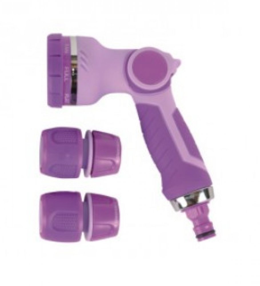 Zahradní zavlažovací komplet je vyroben v pastelových barvách odstínů fialové. Kvalitní zavlažovací pistole s 8 funkcemi zalévaní je doplněna 2 ks rychlospojek pro připojení k zahradní hadici 1/2"