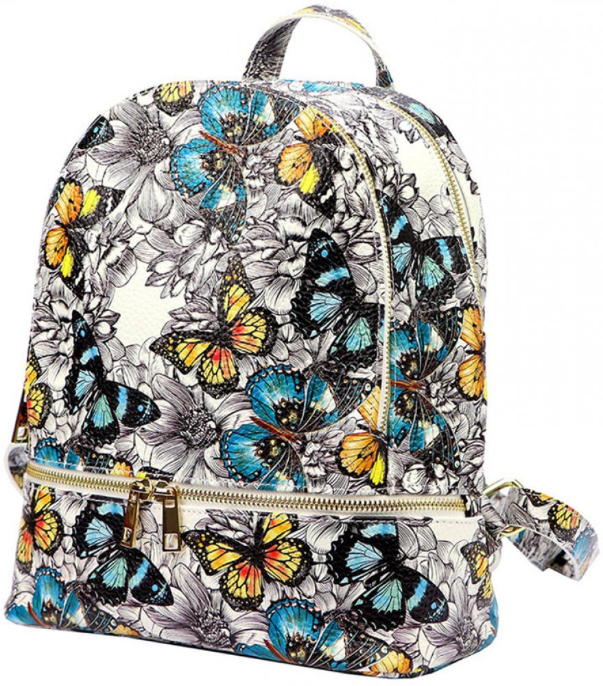 Krásný dámský kožený barevný batoh se vzorem motýlů a zlatými doplňky.