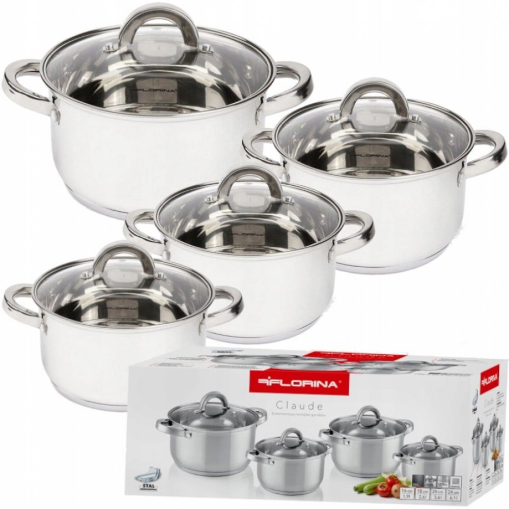 síla nerezi - tělo 0,5mm, dno 0,5mm hliník + 2mm železo + 0,5mm hliník s 18/0 protektorem pro indukci - Indukční dno Sada: - Hrnec s poklicí 16 x 10,5 cm; objem 1,9l - Hrnec s poklicí 18 x 11,5 cm; objem 2,6l - Hrnec s poklicí 20 x 12,5 cm; objem 3,6l - Hrnec s poklicí 24 x 14,5 cm; objem 6,1l Popis: Nádobí je vyrobeno z vysoce kvalitní nerezové oceli, které vděčí za svou vysokou pevnost a odolnost. Speciálně tvarované okraje pro snadné vylévání bez stříkájící vody. Vhodné tloušťky stěny je zárukou kvalitního řemeslného zpracování Ocelové držáky připojené k hrnci nýty zajistí bezpečnost při přenosu. Energeticky úsporné vícevrstvé dno, takže nádoba se rychle zahřívá a udržuje vhodnou teplotu dlouhou dobu. Skleněná poklice s vypouštěcím otvorem pro únik páry je vyrobena z žáruvzdorného tvrzeného skla Vhodné pro všechny typy sporáků včetně indukce.